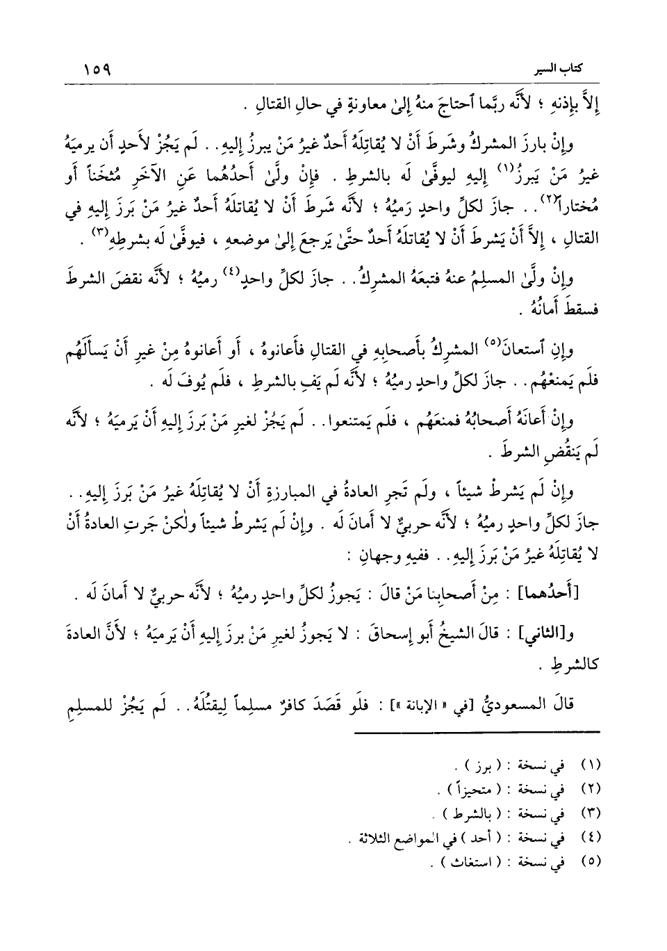 وإن بارز المشرك، وشرط أن لا يقاتله أحد غير من يبرز إليه.. لم يجز لأحد أن يرميه غير من يبرز إليه ليوفى له بالشرط. فإن ولى أحدهما عن الآخر مثخنًا أو مختارًا.. جاز لكل واحد رميه؛ لأنه شرط أن لا يقاتله أحد غير من برز إليه في القتال، إلا أن يشرط أن لا يقاتله أحد حتى يرجع إلى موضعه، فيوفى له بشرطه.