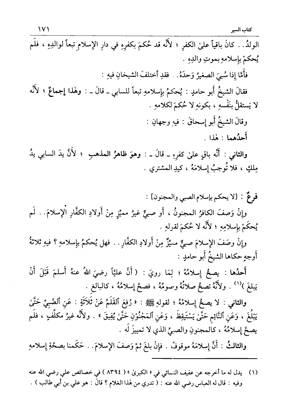 فقال الشيخ أبُو حامد: يحكم بإسلامه تبعًا للسابي ـ قال ـ: وهذا إجماع؛ لأنه لا يستقل بنفسه، بكونه لا حكم لكلامه.