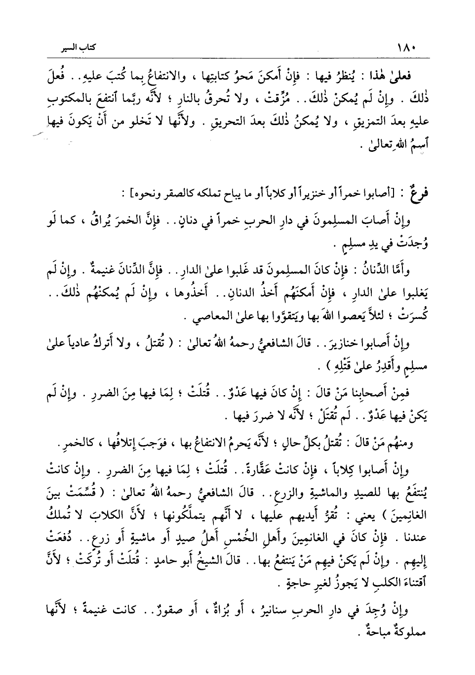 وإن أصابوا كلابًا، فإن كان عقارة.. قتلت؛ لما فيها من الضرر. وإن كانت ينتفع بها للصيد والماشية والزرع.. قال الشافعي، - رَحِمَهُ اللَّهُ تَعَالَى -: (قسمت بين الغانمين) يعني: تقر أيديهم عليها، لا أنهم يتملكونها؛ لأن الكلاب لا تملك عندنا. فإن كان في الغانمين وأهل الخمس أهل صيد أو ماشية أو زرع.. دفعت إليهم. وإن لم يكن فيهم من ينتفع بها.. قال الشيخ أبُو حامد: قتلت أو تركت؛ لأن اقتناء الكلب لا يجوز لغير حاجة.