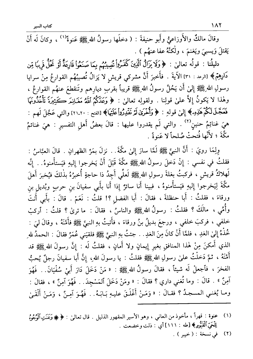 وقال مالك والأَوزَاعِي وأبو حَنِيفَة: (دخلها رسول، الله - صَلَّى اللَّهُ عَلَيْهِ وَسَلَّمَ -، عنوة، وكان له أن يقتل ويسبي ويغنم، ولكنه عفا عنهم) .
