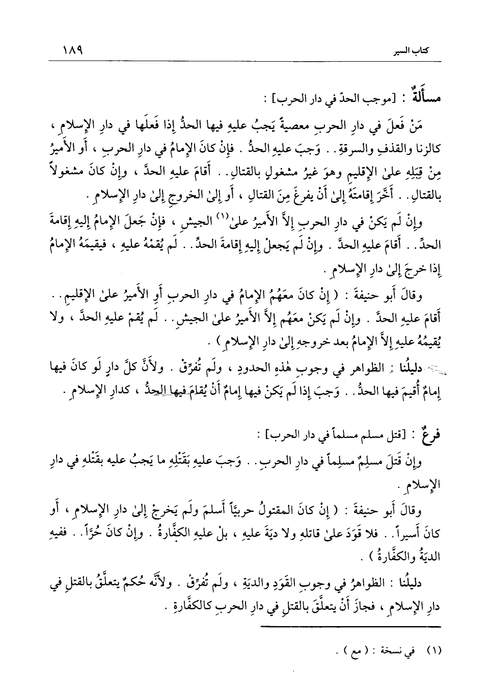 ] : من فعل في دار الحرب معصية يجب عليه فيها الحد إذا فعلها في دار الإسلام، كالزنا والقذف والسرقة.. وجب عليه الحد فإن كان الإمام في دار الحرب، أو الأمير من قبله على الإقليم وهو غير مشغول بالقتال.. أقام عليه الحد، وإن كان مشغولًا بالقتال.. أخر إقامته إلى أن يفرغ من القتال، أو إلى الخروج إلى دار الإسلام.