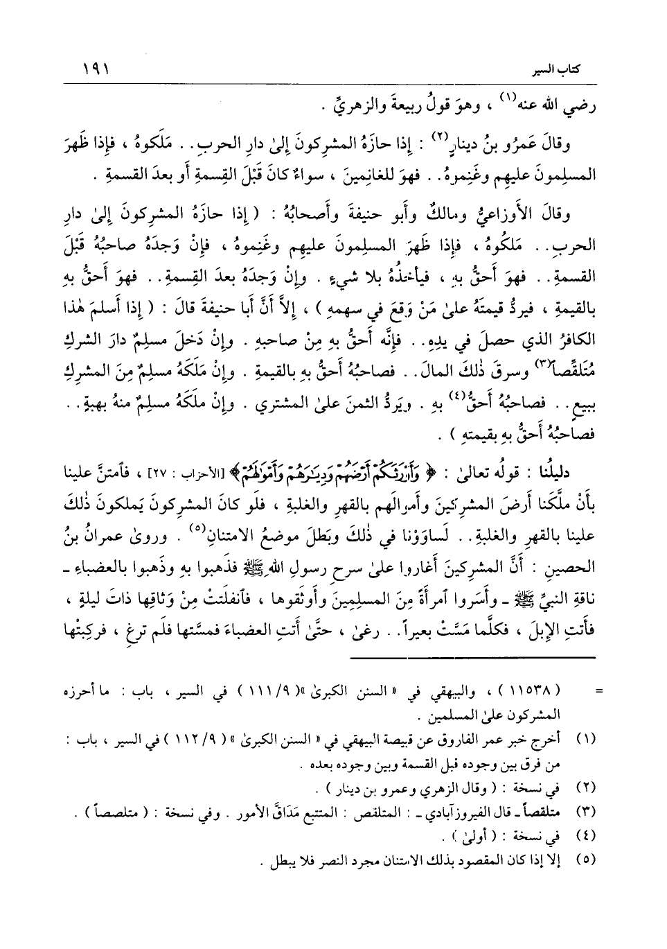 وقال الأَوزَاعِي ومالك وأبو حَنِيفَة وأصحابه: (إذا حازه المشركون إلى دار الحرب.. ملكوه، فإذا ظهر المسلمون عليهم وغنموه، فإن وجده صاحبه قبل القسمة.. فهو أحق به، فيأخذه بلا شيء. وإن وجده بعد القسمة.. فهو أحق به بالقيمة، فيرد قيمته على من وقع في سهمه) ، إلا أن أبا حَنِيفَة قال: (إذا أسلم هذا الكافر الذي حصل في يده.. فإنه أحق به من صاحبه. وإن دخل مسلم دار الشرك متلقصا وسرق ذلك المال.. فصاحبه أحق به بالقيمة.. وإن ملكه مسلم من المشرك ببيع.. فصاحبه أحق به. ويرد الثمن على المشتري. وإن ملكه مسلم منه بهبة.. فصاحبه أحق به بقيمته.