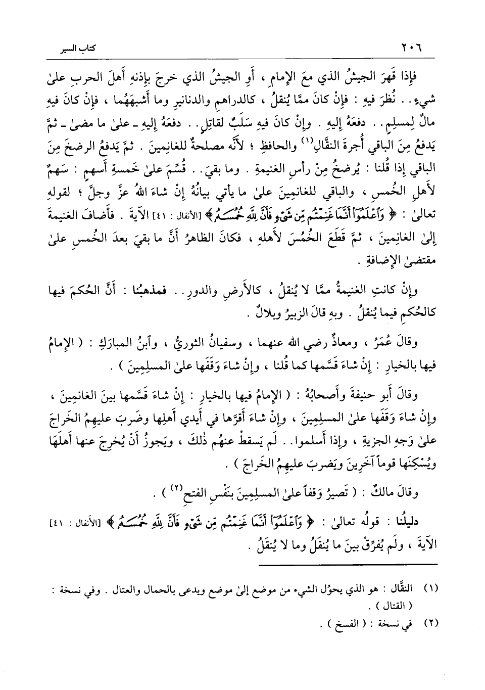 فإذا قهر الجيش الذي مع الإمام، أو الجيش الذي خرج بإذنه أهل الحرب على شيء.. نظر فيه: فإن كان مما ينقل، كالدراهم والدنانير وما أشبههما، فإن كان فيه مال للمسلم.. دفعه إليه. وإن كان فيه سلب لقاتل.. دفعه إليه ـ على ما مَضَى ـ ثم يدفع من الباقي أجرة النقال والحافظ؛ لأنه مصلحة للغانمين. ثم يدفع الرضخ من الباقي إذا قلنا: يرضخ من رأس الغنيمة. وما بقي.. قسم على خمسة أسهم: سهم لأهل الخمس، والباقي للغانمين على ما يأتي بيانه إن شاء الله عز وجل؛ لِقَوْلِهِ تَعَالَى: {وَاعْلَمُوا أَنَّمَا غَنِمْتُمْ مِنْ شَيْءٍ فَأَنَّ لِلَّهِ خُمُسَهُ} [الأنفال: 41] [الأنفال: 41] الآية. فأضاف الغنيمة إلى الغانمين، ثم قطع الخمس لأهله، فكان الظاهر أن ما بقي بعد الخمس على مقتضى الإضافة.