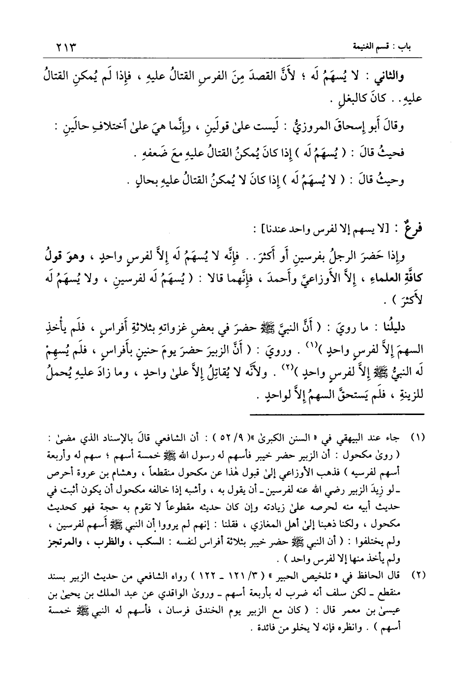 دليلنا: ما روي: «أن النَّبيّ - صَلَّى اللَّهُ عَلَيْهِ وَسَلَّمَ - حضر في بعض غزواته بثلاثة أفراس، فلم يأخذ السهم إلا لفرس واحد» وروي: «أن الزبير حضر يوم حنين بأفراس، فلم يسهم له النَّبيّ - صَلَّى اللَّهُ عَلَيْهِ وَسَلَّمَ -، إلا لفرس واحد» ، ولأنه لا يقاتل إلا على واحد، وما زاد عليه يحمل للزينة، فلم يستحق السهم إلا لواحد.