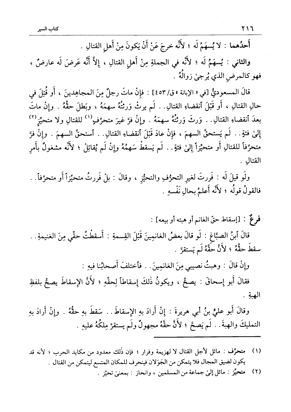 قال المسعوديُّ [في " الإبانة " ق \ 453] : فإن مات رجل من المجاهدين، أو قتل في حال القتال، أو قبل انقضاء القتال.. لم يرث ورثته سهمه، وبطل حقه. وإن مات بعد انقضاء القتال.. ورث ورثته سهمه. وإن فر غير متحرف للقتال ولا متحيز إلى فئة.. لم يستحق السهم، فإن عاد قبل انقضاء القتال.. استحق السهم. وإن فر متحرفًا للقتال أو متحيزًا إلى فئة.. لم يسقط سهمه وإن لم يقاتل؛ لأنه مشغول بأمر القتال.