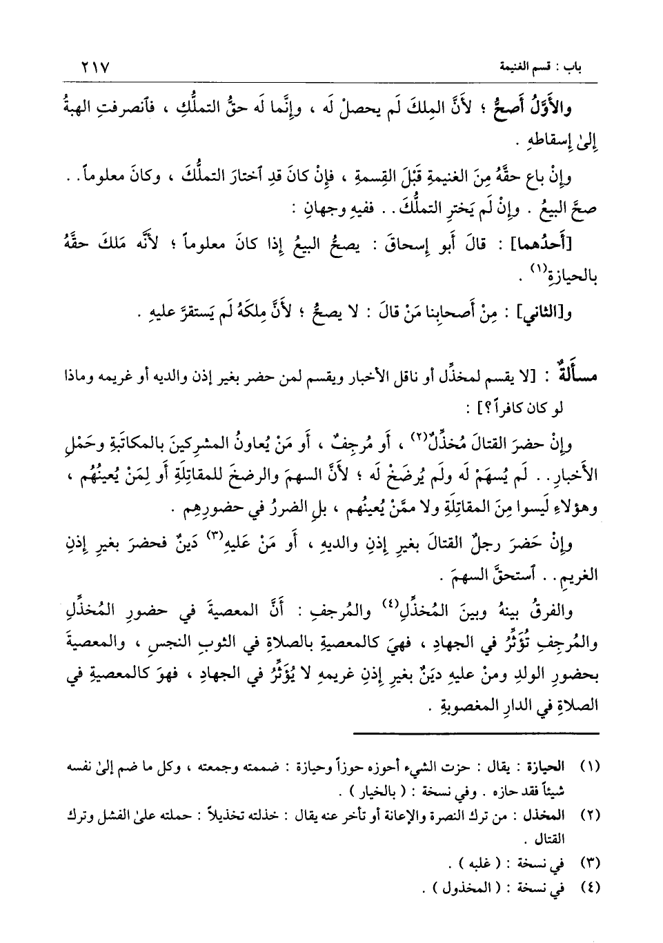 ويقسم لمن حضر بغير إذن والديه أو غريمه وماذا لو كان كافرًا؟] : وإن حضر القتال مخذل، أو مرجف، أو من يعاون المشركين بالمكاتبة وحمل الأخبار.. لم يسهم له ولم يرضخ له؛ لأن السهم والرضخ للمقاتلة أو لمن يعينهم، وهؤلاء ليسوا من المقاتلة ولا ممن يعينهم، بل الضرر في حضورهم.