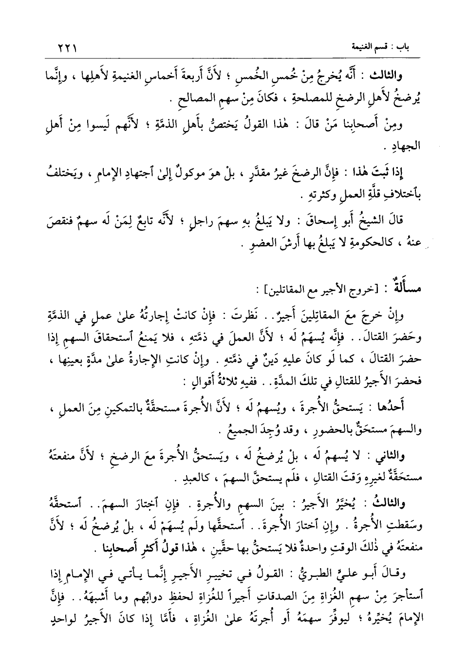 والثالث: يخير الأجير: بين السهم والأجرة. فإن اختار السهم.. استحقه وسقطت الأجرة. وإن اختار الأجرة.. استحقها ولم يسهم له، بل يرضخ له؛ لأن منفعته في ذلك الوقت واحدة فلا يستحق بها حقين، هذا قول أكثر أصحابنا.