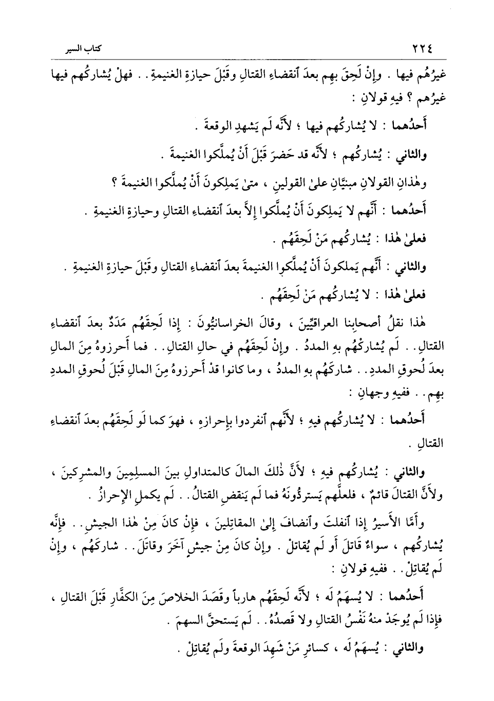 غيرهم فيها. وإن لحق بهم بعد انقضاء القتال وقبل حيازة الغنيمة.. فهل يشاركهم فيها غيرهم؟ فيه قولان: