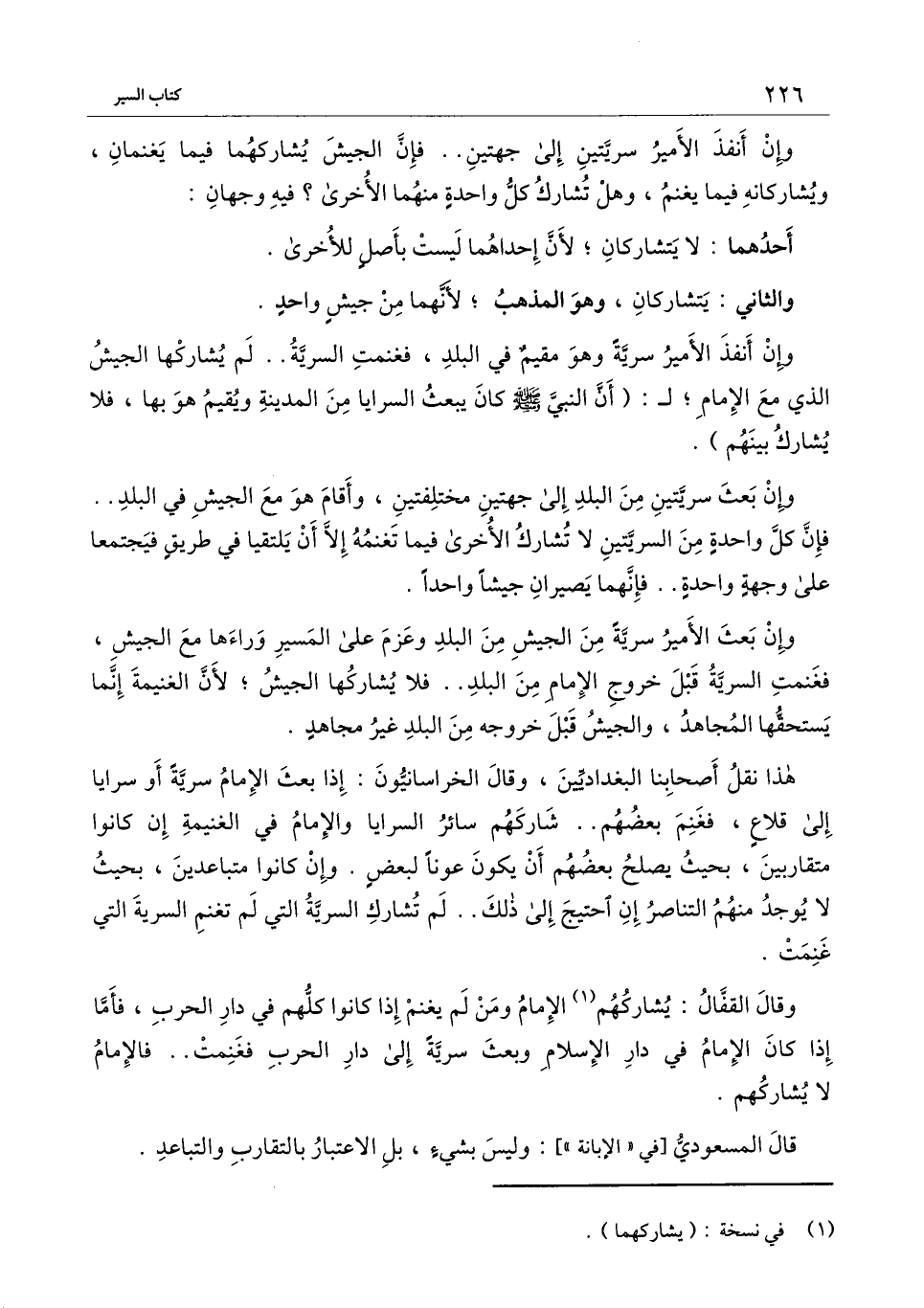 وإن بعث سريتين من البلد إلى جهتين مختلفتين، وأقام هو مع الجيش في البلد.. فإن كل واحدة من السريتين لا تشارك الأخرى فيما تغنمه إلا أن يلتقيا في طريق فيجتمعا على جهة واحدة.. فإنهما يصيران جيشًا واحدًا.