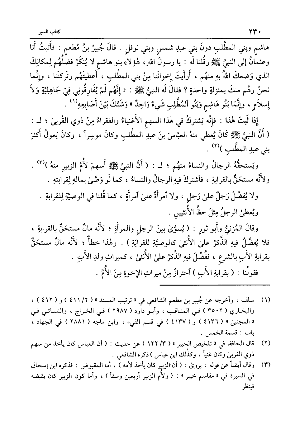 هاشم وبني المطلب دون بني عبد شمس وبني نوفل. «قال جبير بن مطعم: فأتيت أنا وعثمان إلى النَّبيّ - صَلَّى اللَّهُ عَلَيْهِ وَسَلَّمَ -، وقلنا له: يا رسول الله، هؤلاء بنو هاشم لا ينكر فضلهم لمكانك الذي وضعك الله به منهم، أرأيت إخواننا من بني المطلب، أعطيتهم وتركتنا، وإنما نحن وهم منك بمنزلة واحدة؟ فقال له النَّبيّ - صَلَّى اللَّهُ عَلَيْهِ وَسَلَّمَ -: "إنهم لم يفارقوني في جاهلية ولا إسلام، وإنما بنو هاشم وبنو المطلب شيء واحد» وشبك بين أصابعه.