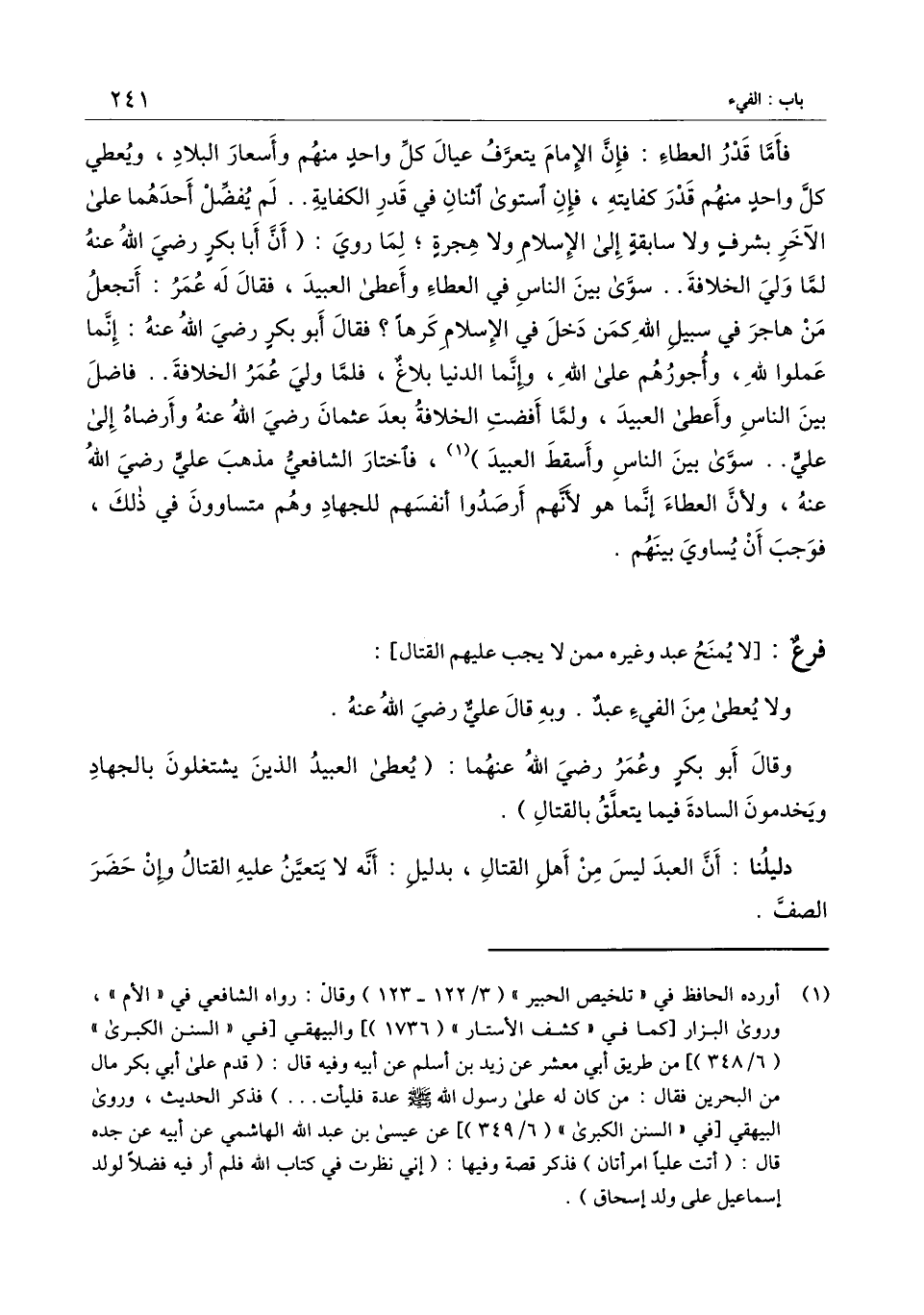 وقال أبُو بكر وعمر - رَضِيَ اللَّهُ عَنْهُمَا -: (يعطى العبيد الذين يشتغلون بالجهاد ويخدمون السادة فيما يتعلق بالقتال) .