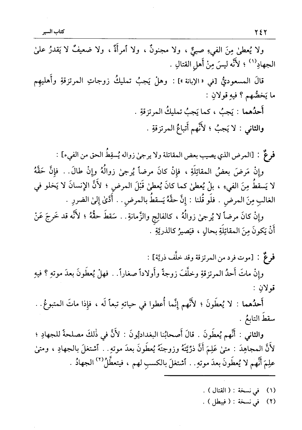 وإن مات أحد المرتزقة وخلف زوجة وأولادًا صغارًا.. فهل يعطون بعد موته؟ فيه قولان: