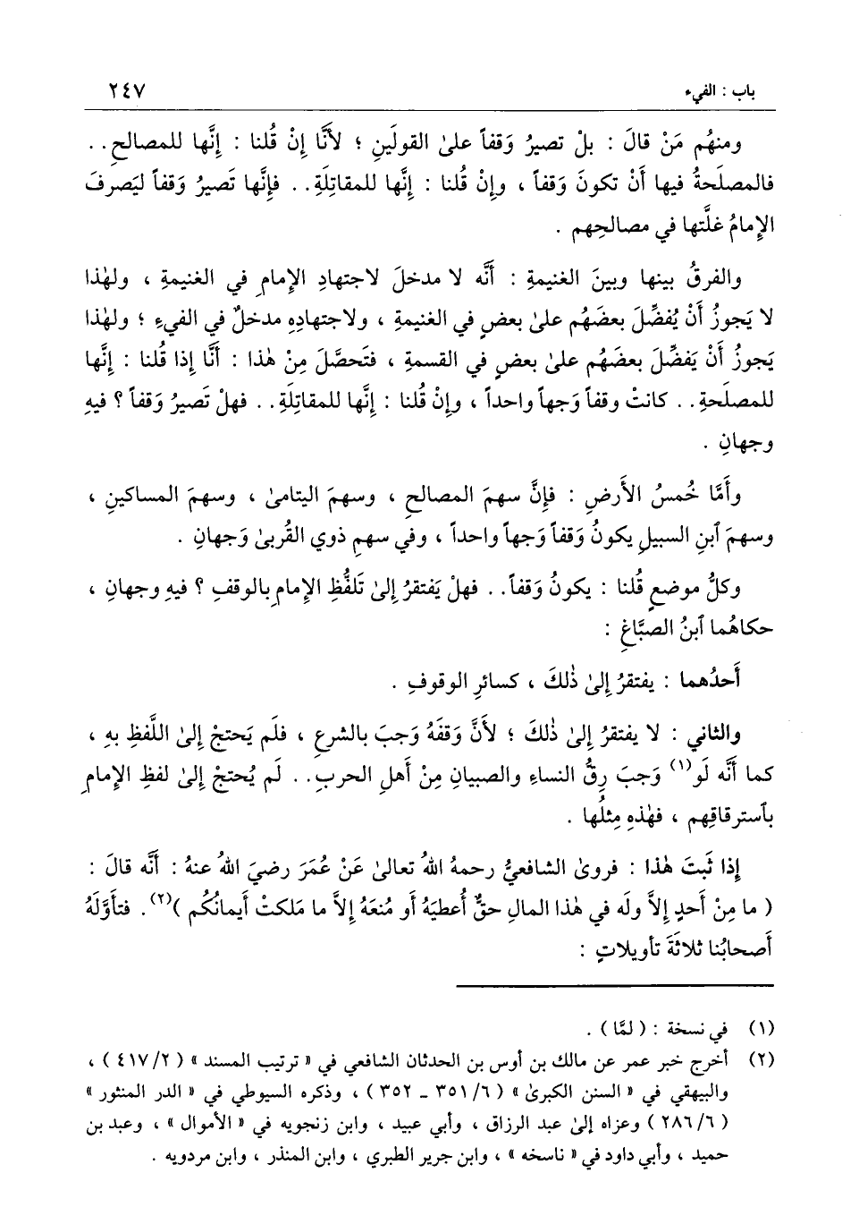 والثاني: لا يفتقر إلى ذلك؛ لأن وقفه وجب بالشَّرعِ، فلم يحتج إلى اللفظ به، كما أنه لو وجب رق النساء والصبيان من أهل الحرب.. لم يحتج إلى لفظ الإمام باسترقاقهم، فهذا مثلها.