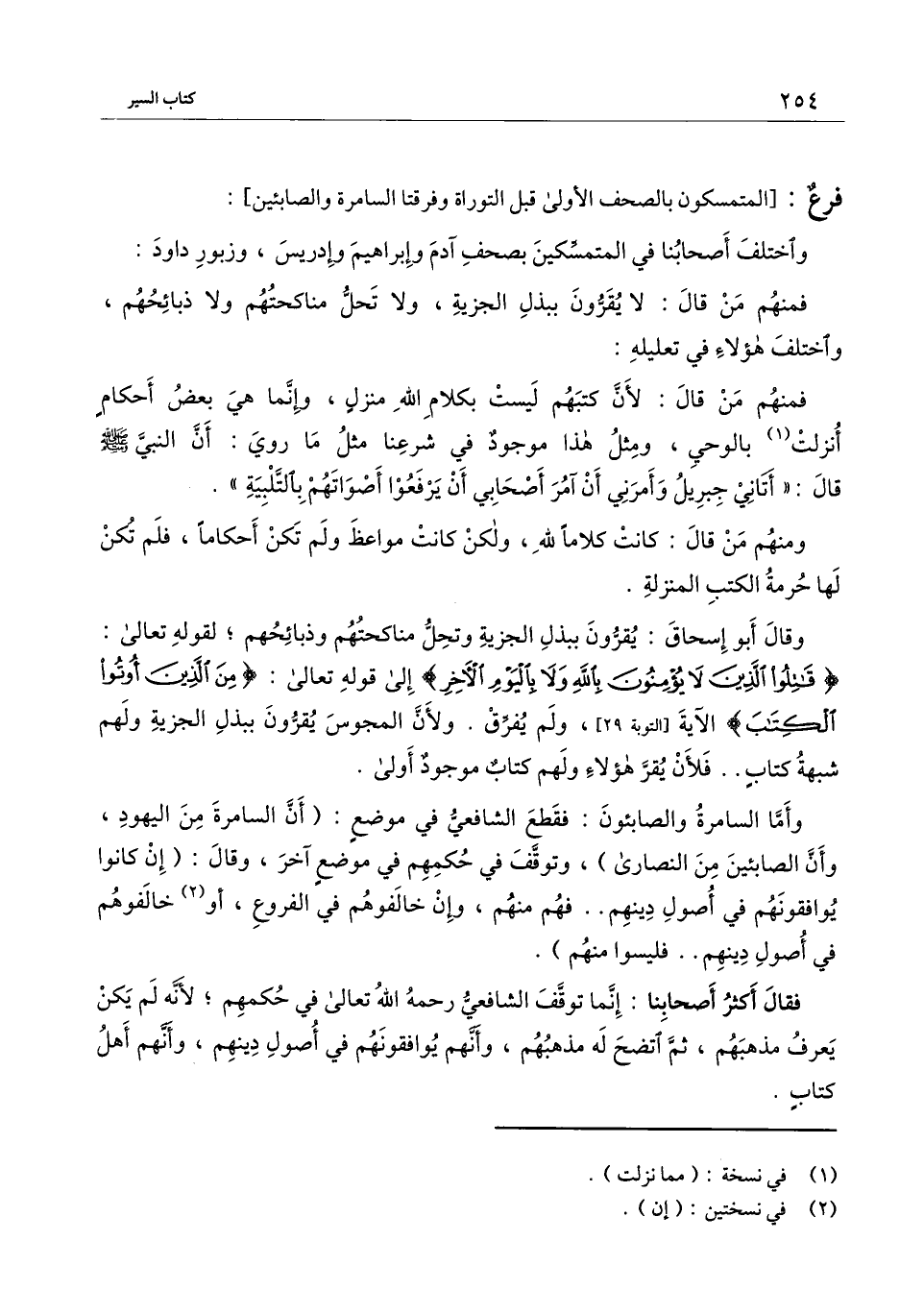 وأمَّا السامرة والصابئون: فقطع الشافعي، في موضع: (أن السامرة من اليهود، وأن الصابئين من النصارى) ، وتوقف في حكمهم في موضع آخر، وقال: (إن كانوا يوافقونهم في أصول دينهم.. فهم منهم، وإن خالفوهم في الفروع، أو خالفوهم في أصول دينهم.. فليسوا منهم) .