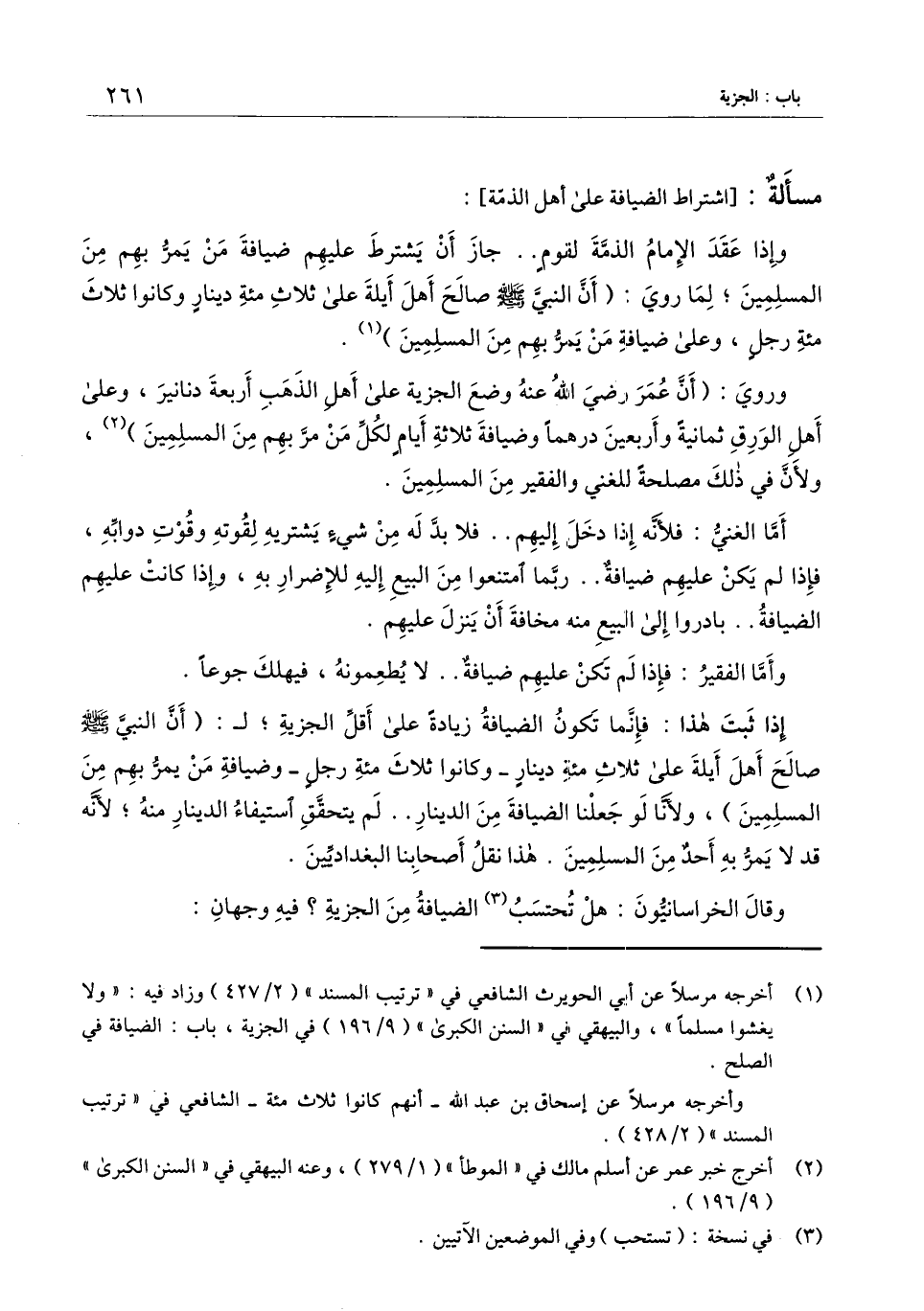 وإذا عقد الإمام الذمة لقوم.. جاز أن يشترط عليهم ضيافة من يمر بهم من المسلمين؛ لما رُوِيَ: «أن النَّبيَّ - صَلَّى اللَّهُ عَلَيْهِ وَسَلَّمَ - صالح أهل أيلة على ثلاثمائة دينار وكانوا ثلاثمائة رجل، وعلى ضيافة من يمر بهم من المسلمين» .