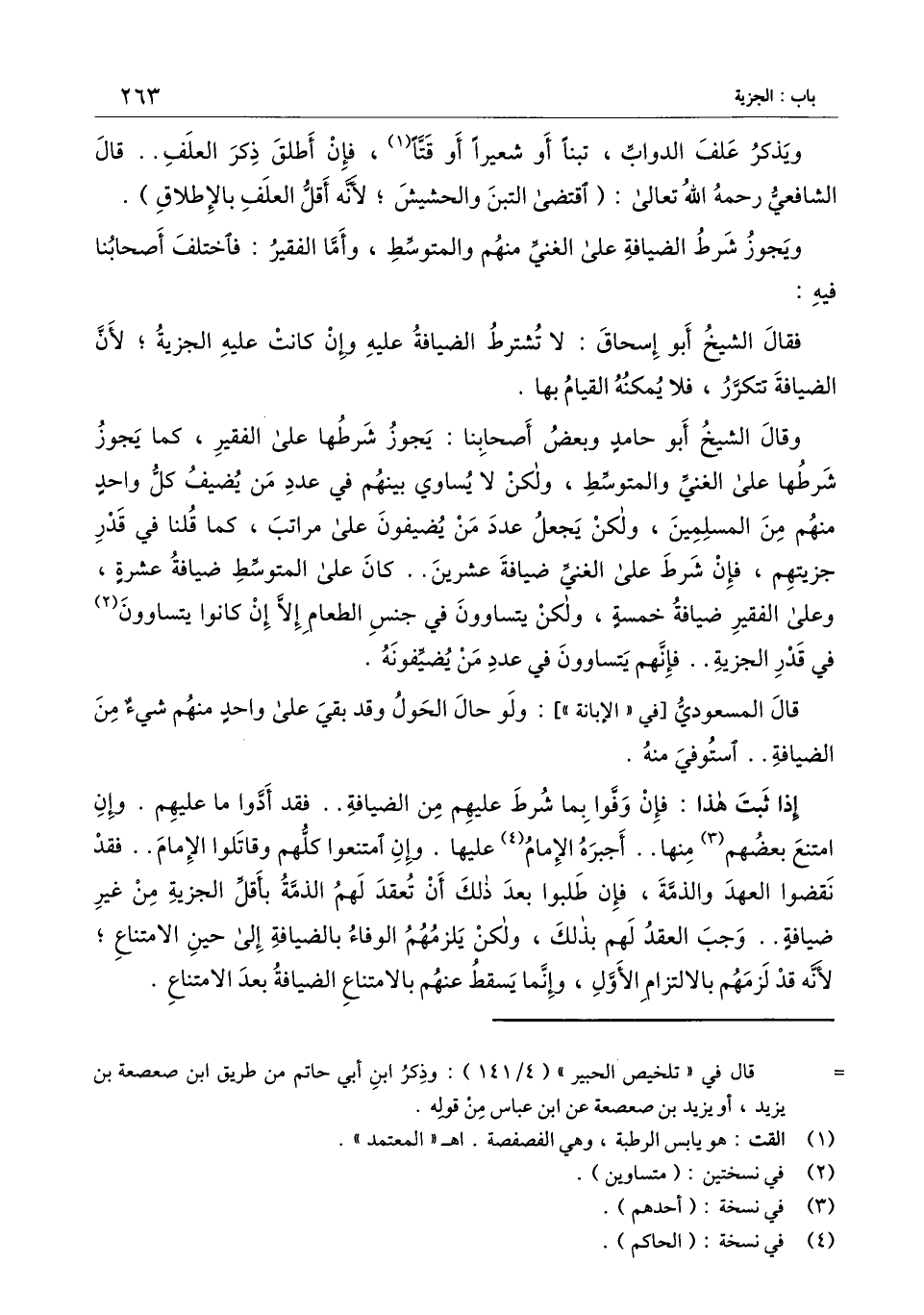 وقال الشيخُ أبُو حامد وبعض أصحابنا: يجوز شرطها على الفقير، كما يجوز شرطها على الغني والمتوسط، ولكن لا يساوي بينهم في عدد من يضيف كل واحد منهم من المسلمين، ولكن يجعل عدد من يضيفون على مراتب، كما قلنا في قدر جزيتهم، فإن شرط على الغني ضيافة عشرين.. كان على المتوسط ضيافة عشرة، وعلى الفقير ضيافة خمسة، ولكن يتساوون في جنس الطعام إلا إن كانوا يتساوون في قدر الجزية.. فإنهم يتساوون في عدد من يضيفونه.