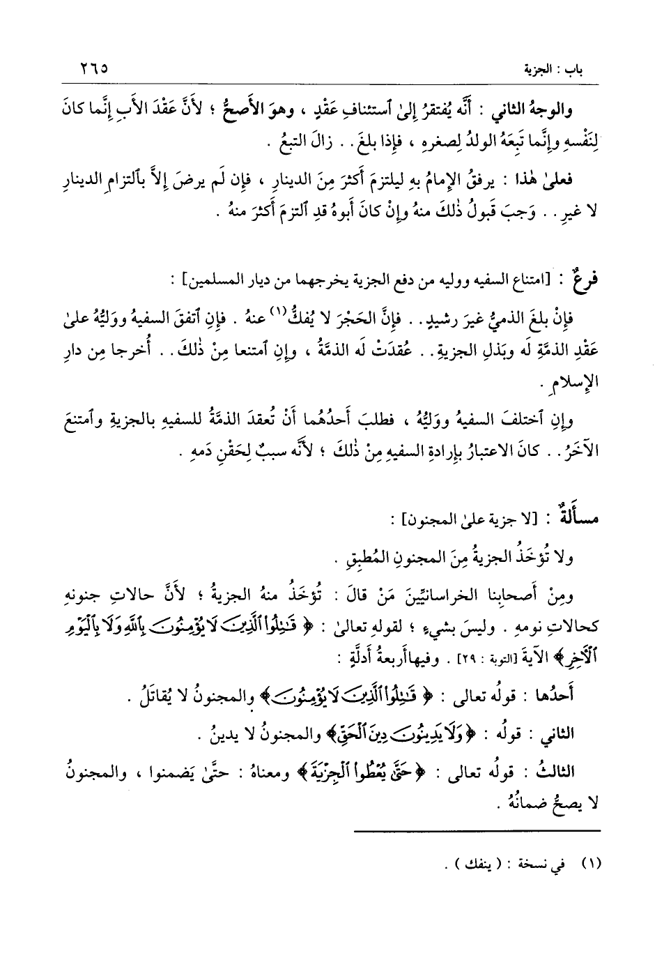 ومن أصحابنا الخراسانيين من قال: تؤخذ منه الجزية؛ لأن حالات جنونه كحالات نومه. وليس بشيء؛ لِقَوْلِهِ تَعَالَى: {قَاتِلُوا الَّذِينَ لا يُؤْمِنُونَ بِاللَّهِ وَلا بِالْيَوْمِ الآخِرِ} [التوبة: 29] الآية [التوبة: 29] وفيها أربعة أدلة:
