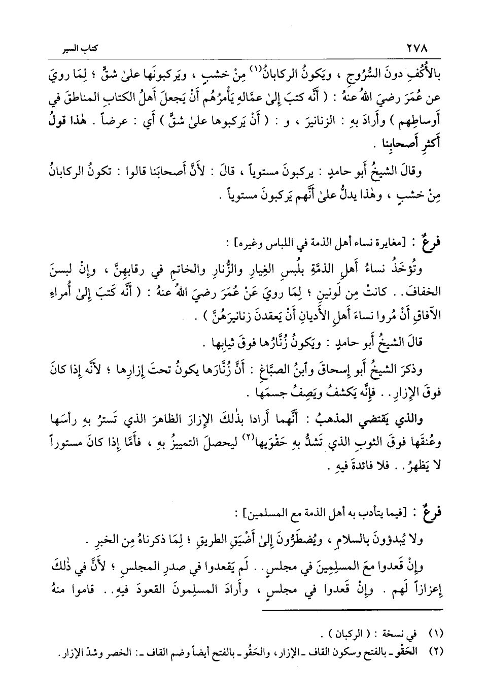 بالأكف دون السروج، ويكون الركابان من خشب، ويركبونها على شق؛ لما رُوِي عن عمر - رَضِيَ اللَّهُ عَنْهُ -: (أنه كتب إلى عماله يأمرهم أن يجعل أهل الكتاب المناطق في أوساطهم) وأراد به: الزنانير، و: (أن يركبوها على شق) أي: عرضا: هذا قول أكثر أصحابنا.