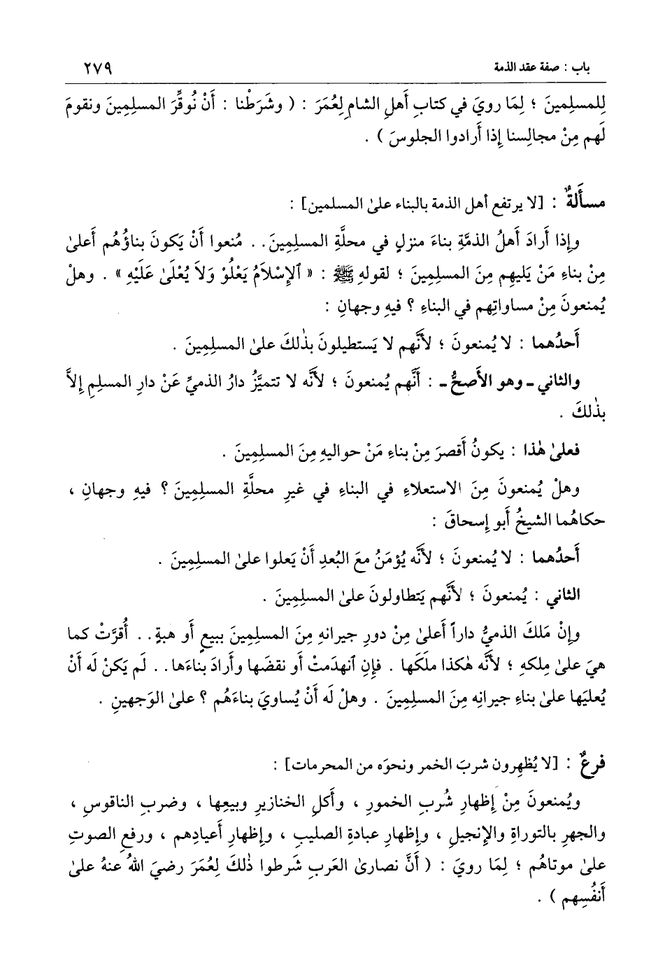 وإذا أراد أهل الذمة بناء منزل في محلة المسلمين.. منعوا أن يكون بناؤهم أعلى من بناء من يليهم من المسلمين؛ لقوله، - صَلَّى اللَّهُ عَلَيْهِ وَسَلَّمَ -: «الإسلام يعلو ولا يعلى عليه» ، وهل يمنعون من مساواتهم في البناء؟ فيه وجهان: