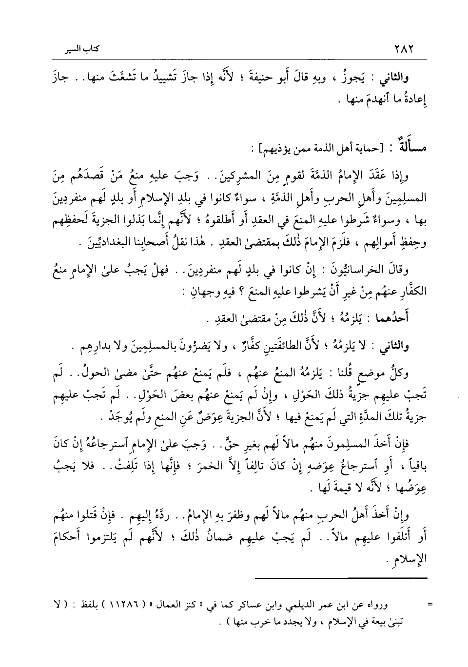 وقال الخراسانيون: إن كانوا في بلد لهم منفردين.. فهل يجب على الإمام منع الكفار عنهم من غير أن يشرطوا عليه المنع؟ فيه وجهان: