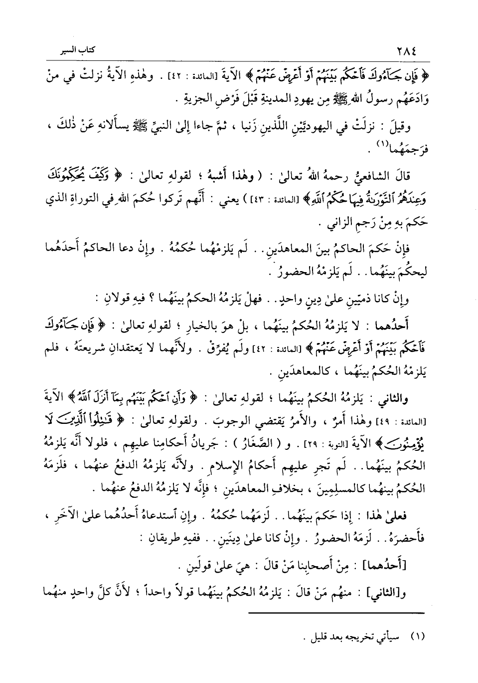 {فَإِنْ جَاءُوكَ فَاحْكُمْ بَيْنَهُمْ أَوْ أَعْرِضْ عَنْهُمْ} [المائدة: 42] الآية [المائدة: 42] وهذا الآية نزلت في من وادعهم رسول الله - صَلَّى اللَّهُ عَلَيْهِ وَسَلَّمَ - من يهود المدينة قبل فرض الجزية.