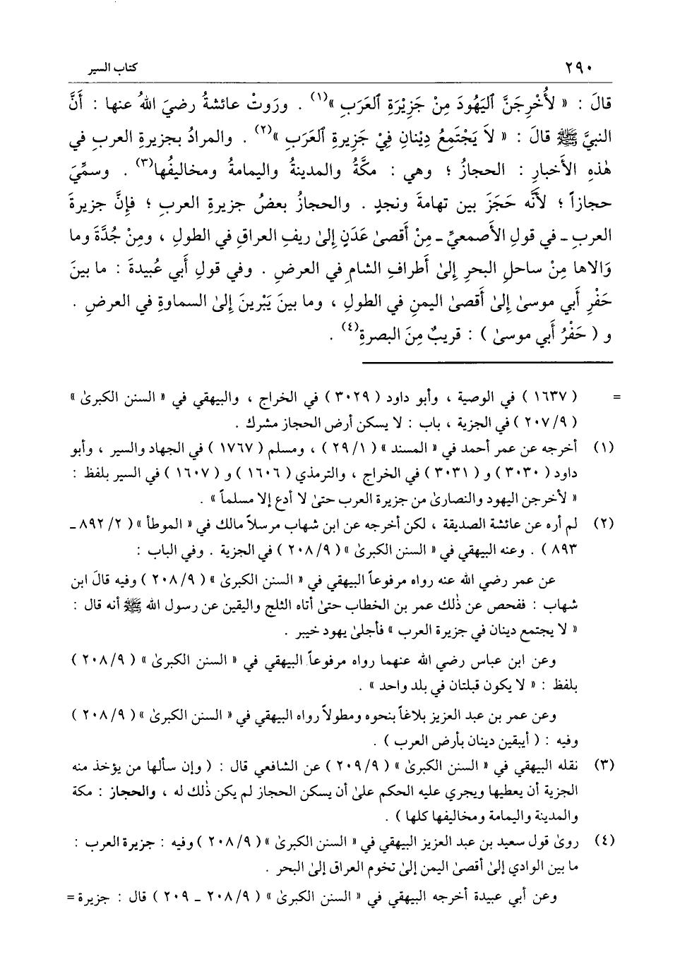 قال: «لأخرجن اليهود من جزيرة العرب» وروت عائشة - رَضِيَ اللَّهُ عَنْهَا -: أن النَّبيَّ - صَلَّى اللَّهُ عَلَيْهِ وَسَلَّمَ - قال: «لا يجتمع دينان في جزيرة العرب» . والمراد بجزيرة العرب في هذه الأخبار: الحجاز؛ وهي: مكة والمدينة واليمامة ومخاليفها. وسمي حجازا؛ لأنه حجز بين تهامة ونجد. والحجاز بعض جزيرة العرب؛ فإن جزيرة العرب - في قول الأصمعي - من أقصى عدن إلى ريف العراق في الطول، ومن جدة وما والاها من ساحل البحر إلى أطراف الشام في العرض. وفي قول أبي عبيدة: ما بين حفر أبي موسى إلى أقصى اليمين في الطول، وما بين يبرين إلى السماوة في العرض.