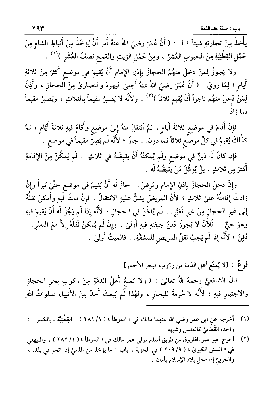 ولا يجوز لمن دخل منهم الحجاز بإذن الإمام أن يقيم في موضع أكثر من ثلاثة أيام؛ لما رُوِيَ: (أن عمر - رَضِيَ اللَّهُ عَنْهُ - أجلى اليهود والنصارى من الحجاز، وأذن لمن دخل منهم تاجرا أن يقيم ثلاثا) . ولأنه لا يصير مقيما بالثلاث، ويصير مقيما بما زاد.