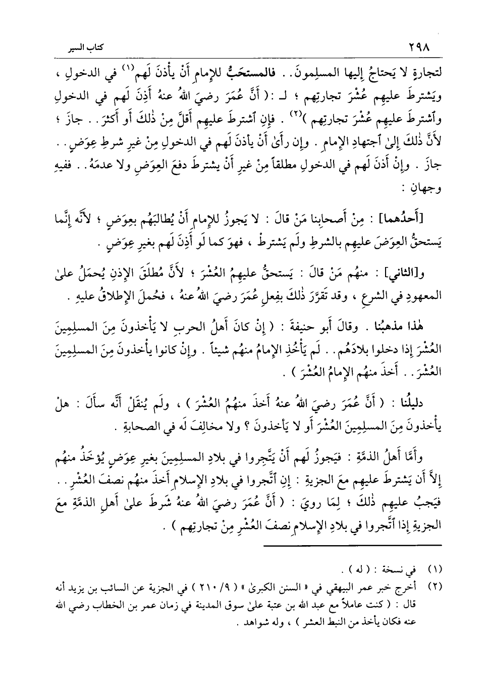وأمَّا أهل الذمة: فيجوز لهم أن يتجروا في بلاد المسلمين بغير عوض يؤخذ منهم إلا أن يشترط عليهم مع الجزية: إن اتجروا في بلاد الإسلام أخذ منهم نصف العشر.. فيجب عليهم ذلك؛ لما رُوِيَ: (أن عمر - رَضِيَ اللَّهُ عَنْهُ - شرط على أهل الذمة مع الجزية إذا اتجروا في بلاد الإسلام نصف العشر من تجارتهم) .