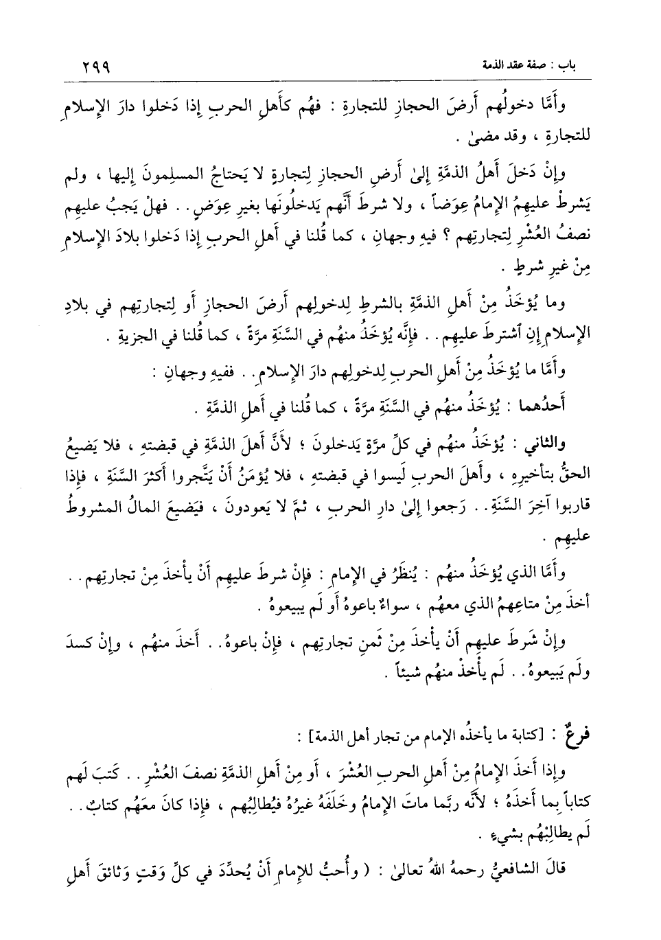 وما يؤخذ من أهل الذمة بالشرط لدخولهم أرض الحجاز أو لتجارتهم في بلاد الإسلام إن اشترط عليهم.. فإنه يؤخذ منهم في السنة مرة، كما قلنا في الجزية.