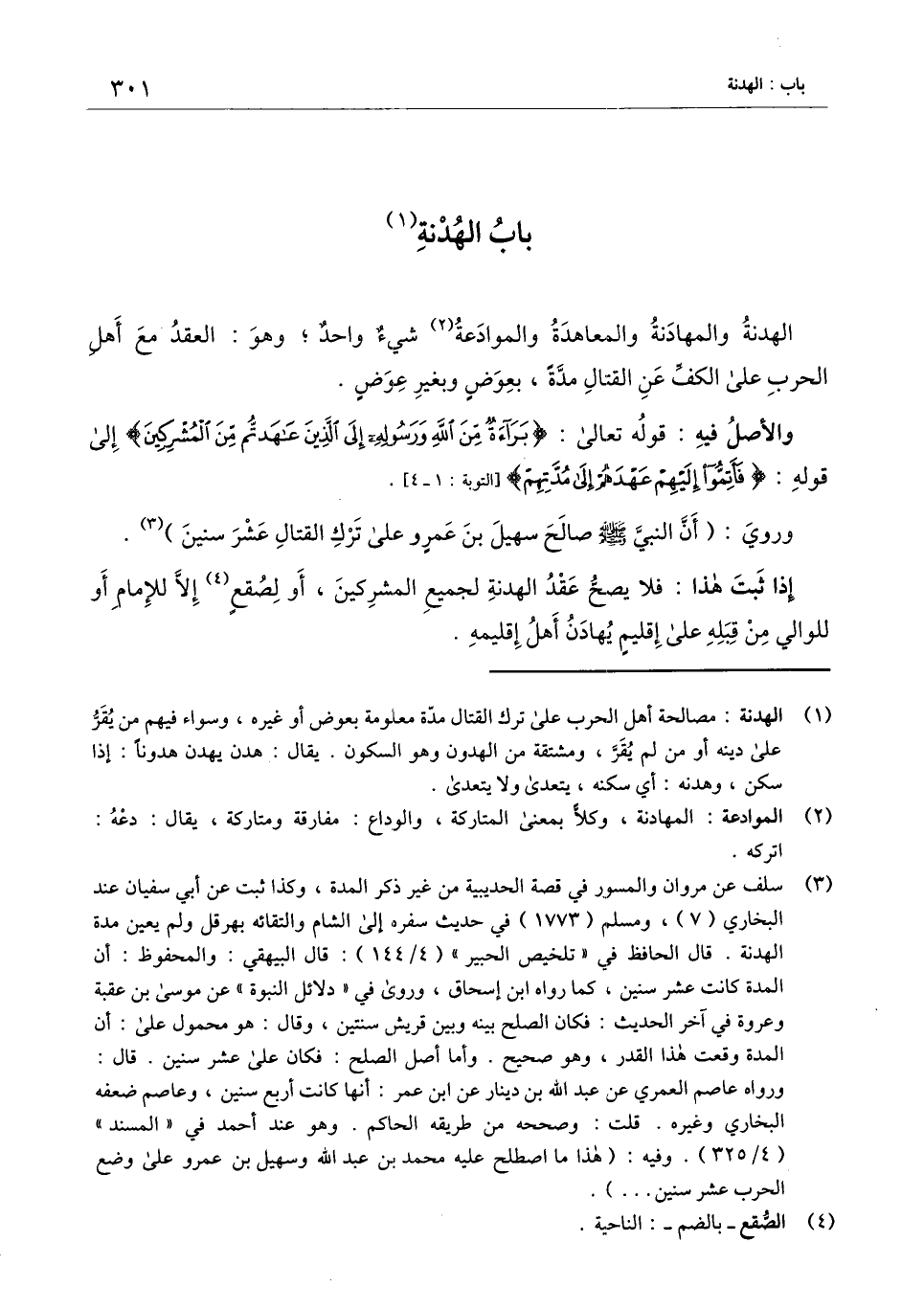 والأصل فيه: قَوْله تَعَالَى: {بَرَاءَةٌ مِنَ اللَّهِ وَرَسُولِهِ إِلَى الَّذِينَ عَاهَدْتُمْ مِنَ الْمُشْرِكِينَ} [التوبة: 1] إلى قوله: {فَأَتِمُّوا إِلَيْهِمْ عَهْدَهُمْ إِلَى مُدَّتِهِمْ} [التوبة: 4] [التوبة: 1-4] .