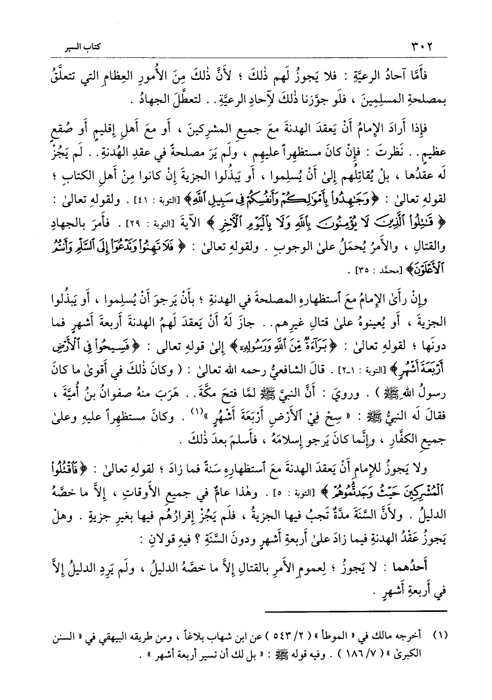 وإن رأى الإمام مع استظهاره المصلحة في الهدنة؛ بأن يرجو أن يسلموا، أو يبذلوا الجزية، أو يعينوه على قتال غيرهم.. جاز له أن يعقد لهم الهدنة أربعة أشهر فما دونها؛ لِقَوْلِهِ تَعَالَى: {بَرَاءَةٌ مِنَ اللَّهِ وَرَسُولِهِ} [التوبة: 1] إلى قَوْله تَعَالَى: {فَسِيحُوا فِي الأَرْضِ أَرْبَعَةَ أَشْهُرٍ} [التوبة: 2] [التوبة: 1-2] . قال الشافعيُّ، - رَحِمَهُ اللَّهُ تَعَالَى -: (وكان ذلك في أقوى ما كان رسول الله، - صَلَّى اللَّهُ عَلَيْهِ وَسَلَّمَ -) . ورُوِي: «أن النَّبيَّ - صَلَّى اللَّهُ عَلَيْهِ وَسَلَّمَ - لما فتح مكة.. هرب منه صفوان بن أمية، فقال له النَّبيّ، - صَلَّى اللَّهُ عَلَيْهِ وَسَلَّمَ -: سح في الأرض أربعة أشهر» وكان مستظهرا عليه وعلى جميع الكفار، وإنما كان يرجو إسلامه، فأسلم بعد ذلك.