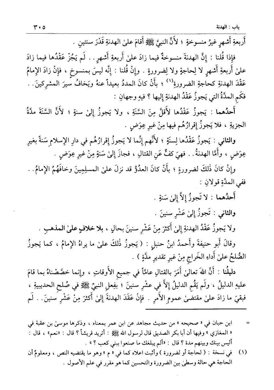 ولا يجوز عقد الهدنة إلى أكثر من عشر سنين بحال، بلا خلاف على المذهب. وقال أبُو حَنِيفَة وأحمد بن حنبل: (يجوز ذلك على ما يراه الإمام، كما يجوز الصلح على أداء الخراج من غير تقدير مدة) .