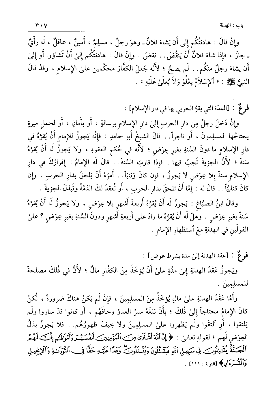 وأمَّا عقد الهدنة على مال يؤخذ من المسلمين، فإن لم يكن هناك ضرورة، لكن كان الإمام محتاجا إلى ذلك؛ بأن بلغه سير العدو وخافهم، أو كانوا قد ساروا ولم يلتقوا، أو التقوا ولم يظهروا على المسلمين ولا خيف ظهورهم.. فلا يجوز بذل العوض لهم؛ لِقَوْلِهِ تَعَالَى: {إِنَّ اللَّهَ اشْتَرَى مِنَ الْمُؤْمِنِينَ أَنْفُسَهُمْ وَأَمْوَالَهُمْ بِأَنَّ لَهُمُ الْجَنَّةَ يُقَاتِلُونَ فِي سَبِيلِ اللَّهِ فَيَقْتُلُونَ وَيُقْتَلُونَ وَعْدًا عَلَيْهِ حَقًّا فِي التَّوْرَاةِ وَالإِنْجِيلِ وَالْقُرْآنِ} [التوبة: 111] [التوبة: 111] .