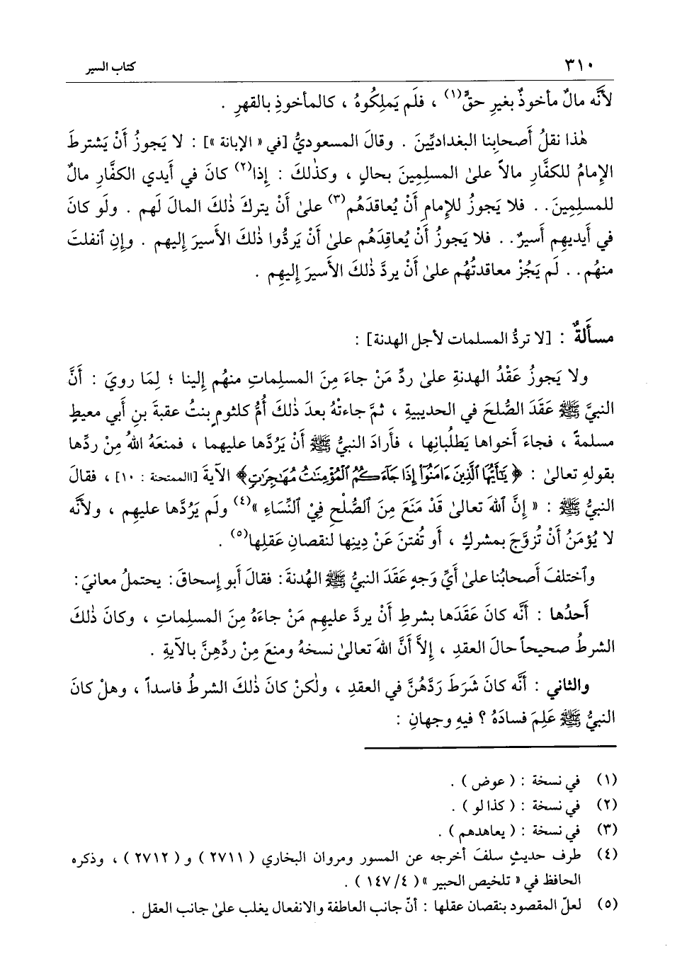 هذا نقل أصحابنا البغداديين. وقال المسعودي [في " الإبانة "] : لا يجوز أن يشترط الإمام للكفار مالا على المسلمين بحال، وكذلك: إذا كان في أيدي الكفار مال للمسلمين.. فلا يجوز للإمام أن يعاقدهم على أن يترك ذلك المال لهم. ولو كان في أيديهم أسير.. فلا يجوز أن يعاقدهم على أن يردوا ذلك الأسير إليهم. وإن انفلت منهم.. لم يجز معاقدتهم على أن يرد ذلك الأسير إليهم.