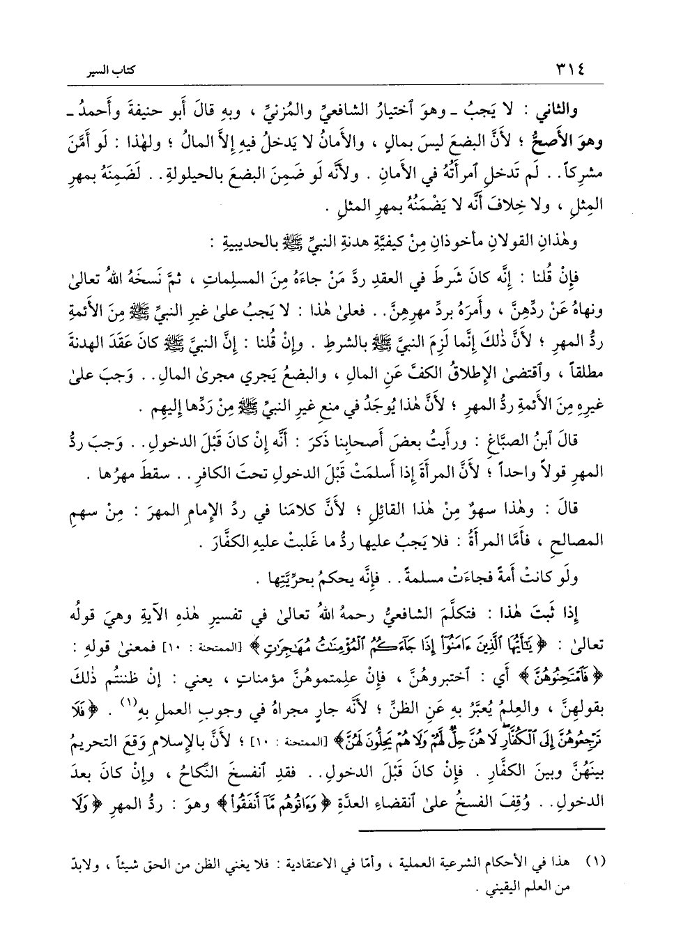 إذا ثبت هذا: فتكلم الشافعيُّ، - رَحِمَهُ اللَّهُ تَعَالَى - في تفسير هذه الآية وهي قَوْله تَعَالَى: {يَا أَيُّهَا الَّذِينَ آمَنُوا إِذَا جَاءَكُمُ الْمُؤْمِنَاتُ مُهَاجِرَاتٍ} [الممتحنة: 10] [الممتحنة: 10] فمعنى قوله: {فَامْتَحِنُوهُنَّ} [الممتحنة: 10] أي: اختبروهن، فإن علمتموهن مؤمنات، يعني: إن ظننتم ذلك بقولهن، والعلم يعبر به عن الظن؛ لأنه جار مجراه في وجوب العمل به. {فَلا تَرْجِعُوهُنَّ إِلَى الْكُفَّارِ لا هُنَّ حِلٌّ لَهُمْ وَلا هُمْ يَحِلُّونَ لَهُنَّ} [الممتحنة: 10] [الممتحنة: 10] لأن بالإسلام وقع التحريم بينهن وبين الكفار. فإن كان قبل الدخول. فقد انفسخ النكاح، وإن كان بعد الدخول.. وقف الفسخ على انقضاء العدة. {وَآتُوهُمْ مَا أَنْفَقُوا} [الممتحنة: 10] وهو: رد المهر