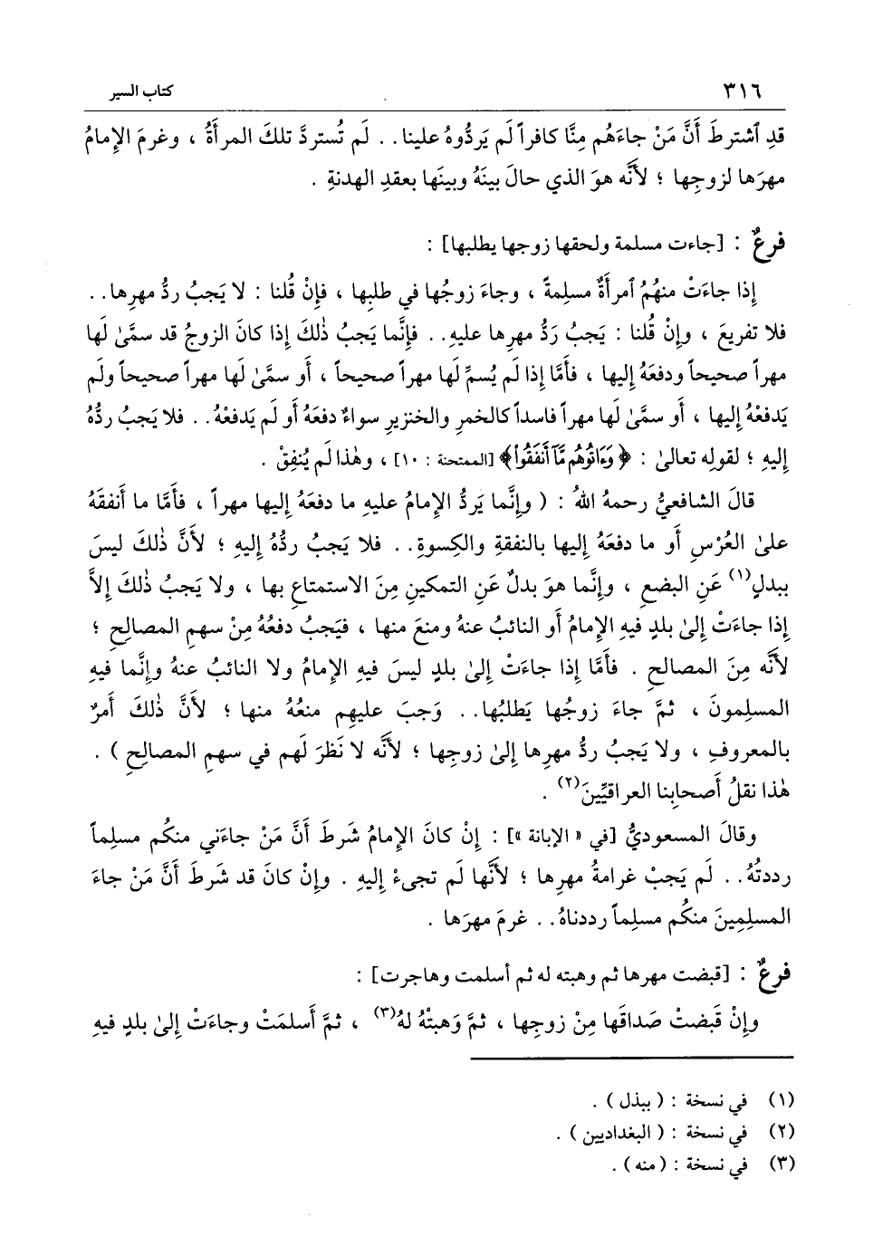 قال الشافعيُّ، - رَحِمَهُ اللَّهُ -: (وإنما يرد الإمام عليه ما دفعه إليها مهرا، فأما ما أنفقه على العرس أو ما دفعه إليها بالنفقة والكسوة.. فلا يجب رده إليه؛ لأن ذلك ليس ببدل عن البضع، وإنما هو بدَّل عن التمكين من الاستمتاع بها؛ ولا يجب ذلك إلا إذا جاءت إلى بلد فيه الإمام أو النائب عنه ومنع منها، فيجب دفعه من سهم المصالح؛ لأنه من المصالح. فأما إذا جاءت إلى بلد ليس فيه الإمام ولا النائب عنه وإنما فيه المسلمون، ثم جاء زوجها يطلبها.. وجب عليهم منعه منها؛ لأن ذلك أمر بالمعروف، ولا يجب رد مهرها إلى زوجها؛ لأنه لا نظر لهم في سهم المصالح) . هذا نقل أصحابنا العراقيين.