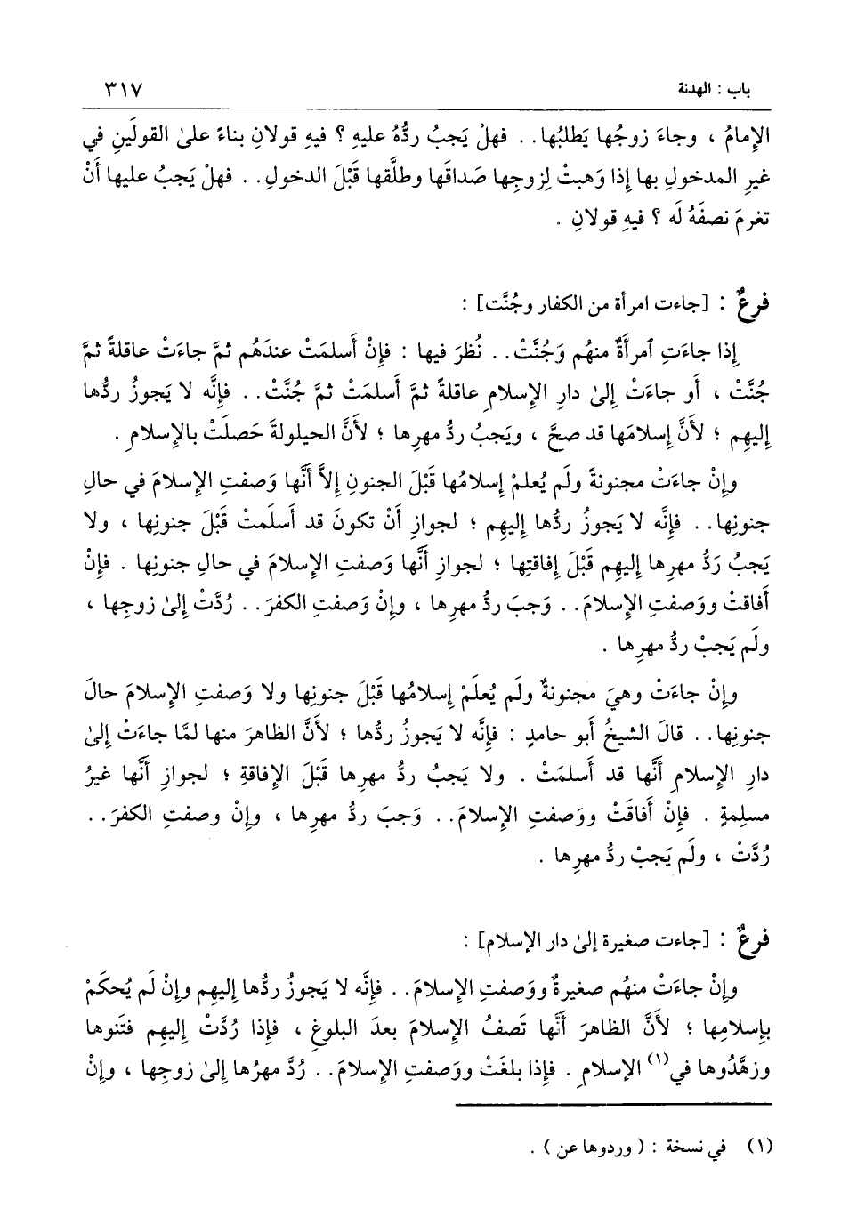 وإن جاءت وهي مجنونة ولم يعلم إسلامها قبل جنونها ولا وصفت الإسلام حال جنونها.. قال الشيخُ أبُو حامد: فإنه لا يجوز ردها؛ لأن الظاهر منها لما جاءت إلى دار الإسلام أنها قد أسلمت. ولا يجب رد مهرها قبل الإفاقة؛ لجواز أنها غير مسلمة. فإن أفاقت ووصفت الإسلام.. وجب رد مهرها، وإن وصفت الكفر.. ردت، ولم يجب رد مهرها.