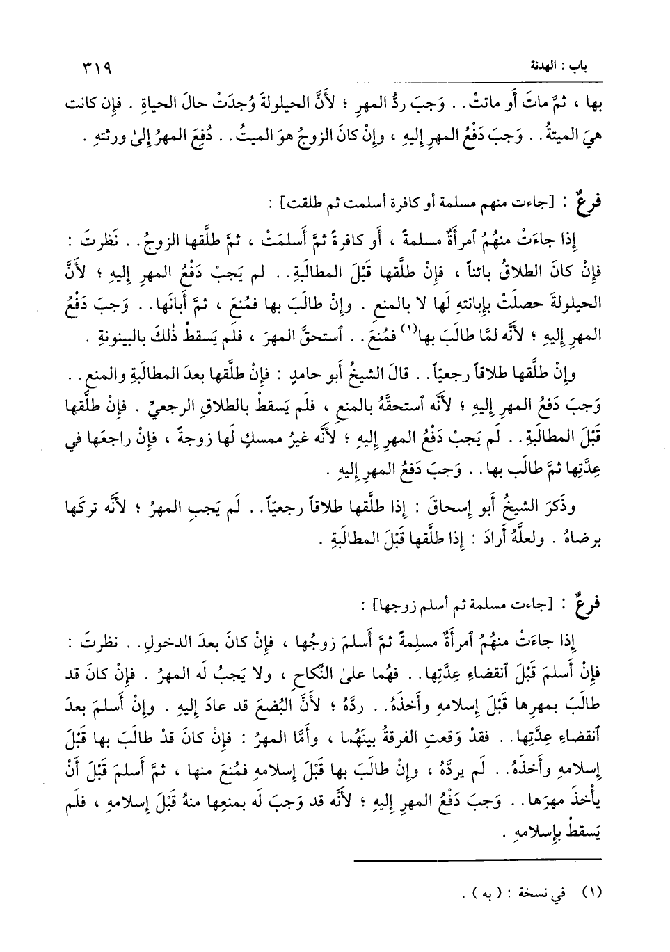 إذا جاءت منهم امرأة مسلمة، أو كافرة ثم أسلمت، ثم طلقها الزوج.. نظرت: فإن كان الطلاق بائنا، فإن طلقها قبل المطالبة.. لم يجب دفع المهر إليه؛ لأن الحيلولة حصلت بإبانته لها لا بالمنع. وإن طالب بها فمنع، ثم أبانها.. وجب دفع المهر إليه؛ لأنه لما طالب بها فمنع.. استحق المهر، فلم يسقط ذلك بالبينونة.