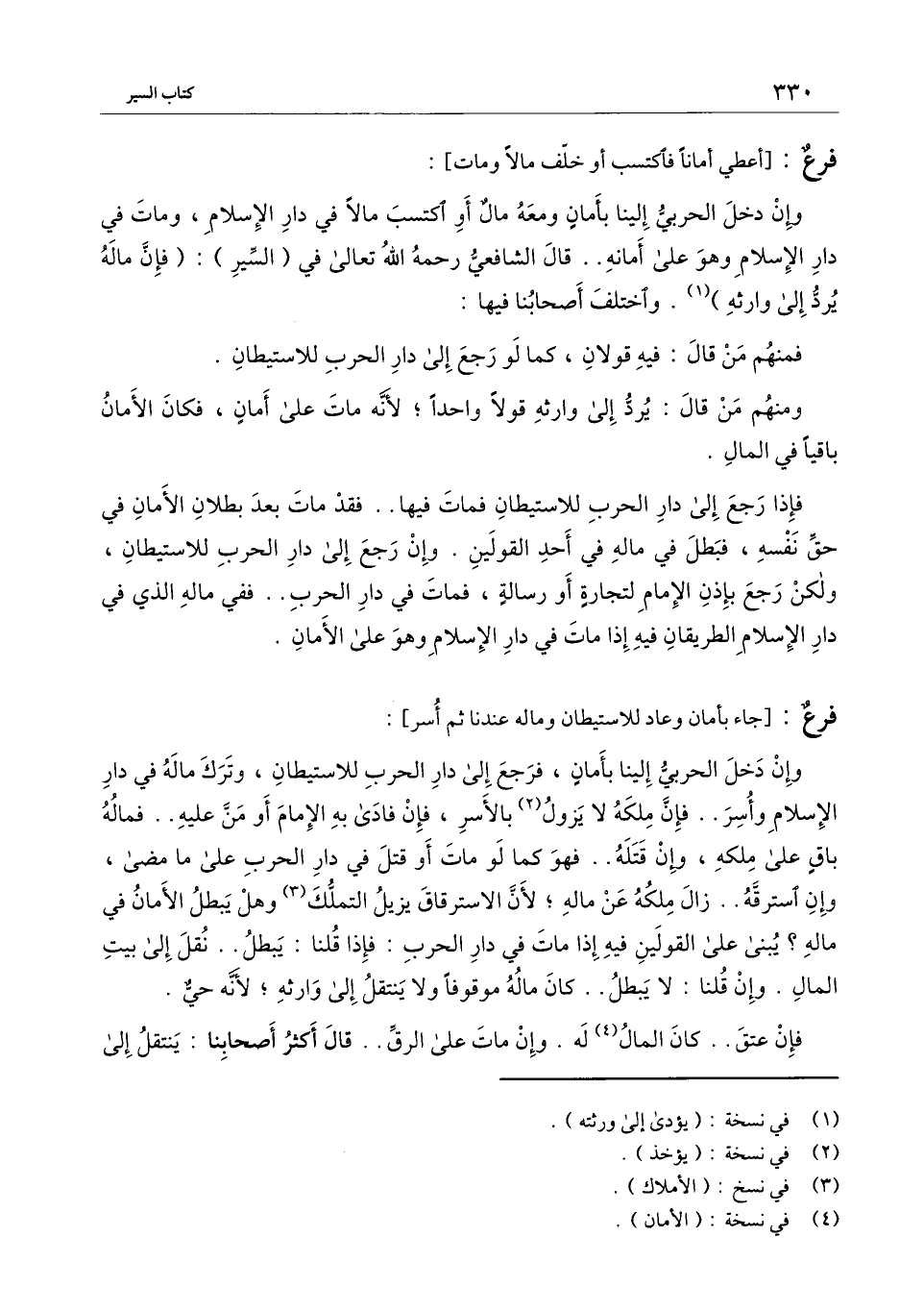 فإذا رجع إلى دار الحرب للاستيطان فمات فيها.. فقد مات بعد بطلان الأمان في حق نفسه، فبطل في ماله في أحد القولين.. وإن رجع إلى دار الحرب للاستيطان، ولكن رجع بإذن الإمام لتجارة أو رسالة، فمات في دار الحرب.. ففي ماله الذي في دار الإسلام الطريقان فيه إذا مات في دار الإسلام وهو على الأمان.