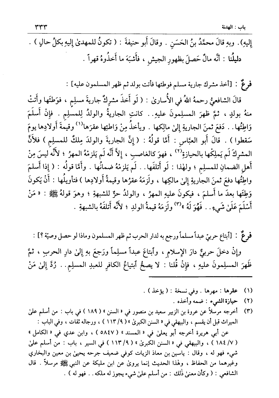 ] : قال الشافعيُّ، - رَحِمَهُ اللَّهُ - في الأسارى: (لو أخذ مشرك جارية مسلم، فوطئها وأتت منه بولد، ثم ظهر المسلمون عليه.. كانت الجارية والولد للمسلم. فإن أسلم واطئها. دفع ثمن الجارية إلى مالكها. ويأخذ من واطئها عقرها وقيمة أولادها يوم سقطوا) . قال أبُو العباس: أما قوله: (إن الجارية والولد ملك للمسلم) فلأن المشرك لم يملكها بالحيازة، فهو كالغاصب، إلا أنه لم يلزمه المهر؛ لأنه ليس من أهل الضمان للمسلم؛ ولهذا: لو أتلفها.. لم يلزمه ضمانها. وأمَّا قوله: (إذا أسلم واطئها دفع ثمن الجارية إلى مالكها، ولزمه عقرها وقيمة أولادها) فتأويلها: أن يكون وطئها بعدما أسلم، فيكون عليه المهر، والولد حر للشبهة؛ وهو قوله، - صَلَّى اللَّهُ عَلَيْهِ وَسَلَّمَ -: «من أسلم على شيء.. فهو له» ولزمه قيمة الولد؛ لأنه أتلفه بالشبهة.