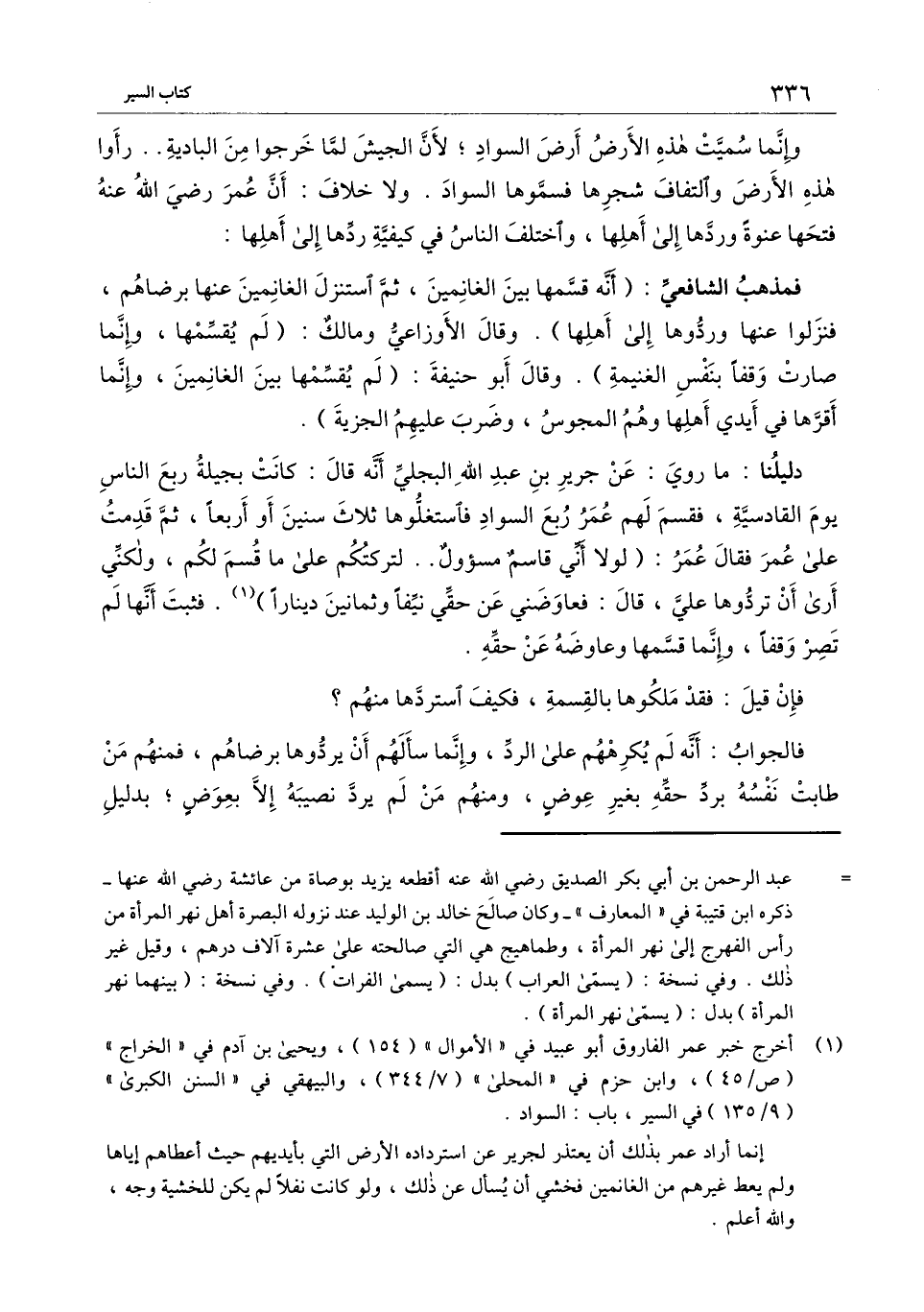 وإنما سميت هذه الأرض أرض السواد؛ لأن الجيش لما خرجوا من البادية.. رأوا هذه الأرض والتفاف شجرها فسموها السواد. ولا خلاف: أن عمر - رَضِيَ اللَّهُ عَنْهُ - فتحها عنوة وردها إلى أهلها، واختلف الناس في كيفية ردها إلى أهلها: