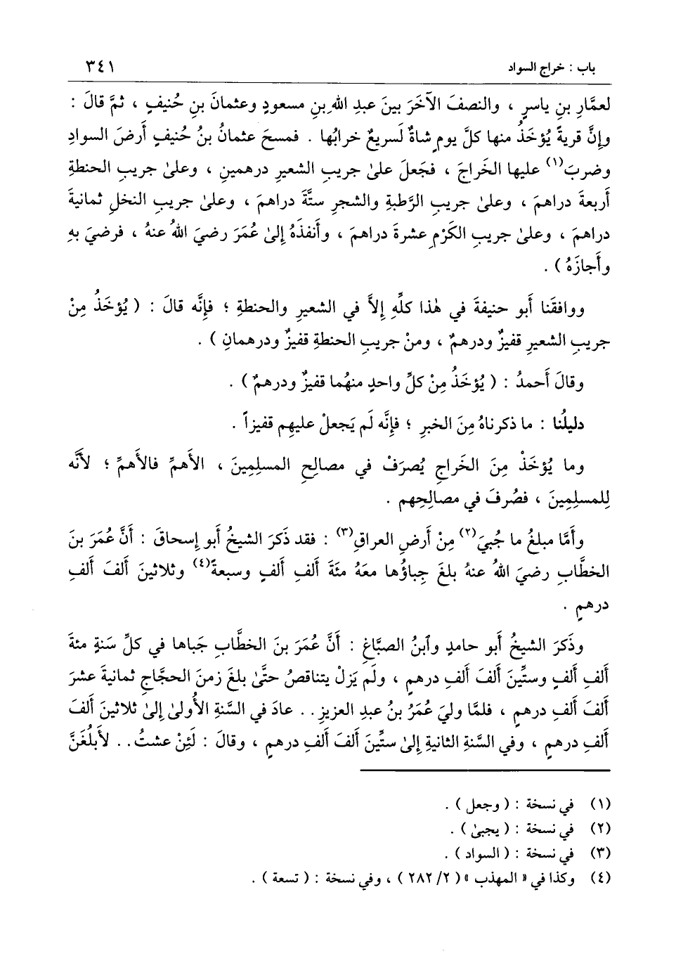 لعمار بن ياسر، والنصف الآخر بين عبد الله بن مَسعُودٍ وعثمان بن حنيف، ثم قال: وإن قرية يؤخذ منها كل يوم شاة لسريع خرابها. فمسح عُثمانَ بن حنيف أرض السواد وضرب عليها الخراج، فجعل على جريب الشعير درهمين، وعلى جريب الحنطة أربعة دراهم، وعلى جريب الرطبة والشجر ستة دراهم، وعلى جريب النخل ثمانية دراهم، وعلى جريب الكرم عشرة دراهم، وأنفذه إلى عمر - رَضِيَ اللَّهُ عَنْهُ -، فرضي به وأجازه) .