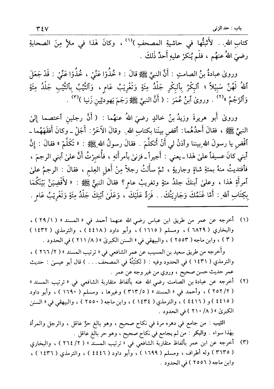 وروى عبادة بن الصامت: أن النَّبيَّ - صَلَّى اللَّهُ عَلَيْهِ وَسَلَّمَ - قال: «خذوا عني، خذوا عني: قد جعل الله لهن سبيلا؛ البكر بالبكر جلد مائة وتغريب عام، والثيب بالثيب جلد مائة والرجم» ورَوَى ابن عمر: «أن النَّبيَّ - صَلَّى اللَّهُ عَلَيْهِ وَسَلَّمَ - رجم يهوديين زنيا» .
