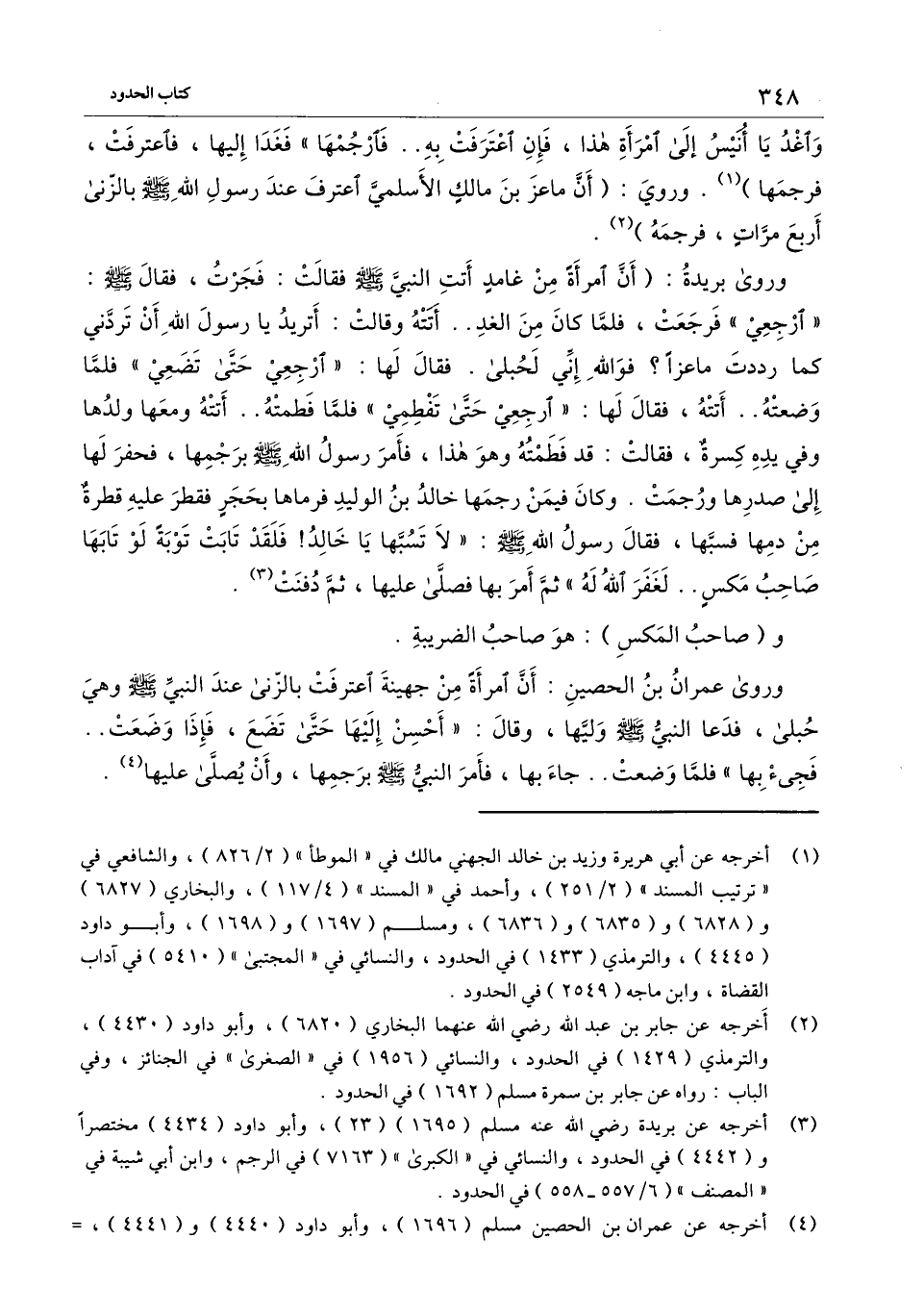 واغد يا أنيس إلى امرأة هذا، فإن اعترفت به.. فارجمها فغدا إليها، فاعترفت، فرجمها» ورُوِي: «أن ماعز بن مالك الأسلمي اعترف عند رسول الله - صَلَّى اللَّهُ عَلَيْهِ وَسَلَّمَ - بالزِّنَى أربع مرات، فرجمه»
