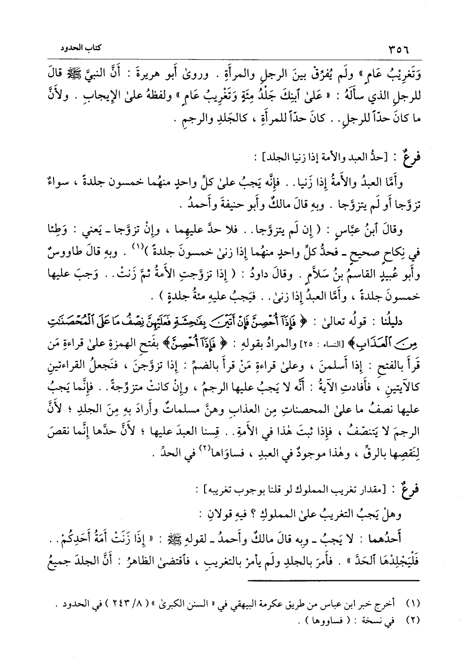 وقال ابن عبَّاس: (إن لم يتزوجا.. فلا حد عليهما، وإن تزوجا- يعني: وطئا في نكاح صحيح- فحد كل واحد منهما إذا زنَى خمسون جلدة) . وبه قال طاووس وأبو عبيد القاسم بن سلام. وقال داود: (إذا تزوجت الأمة ثم زنت.. وجب عليها خمسون جلدة، وأمَّا العبد إذا زنَى.. فيجب عليه مائة جلدة) .
