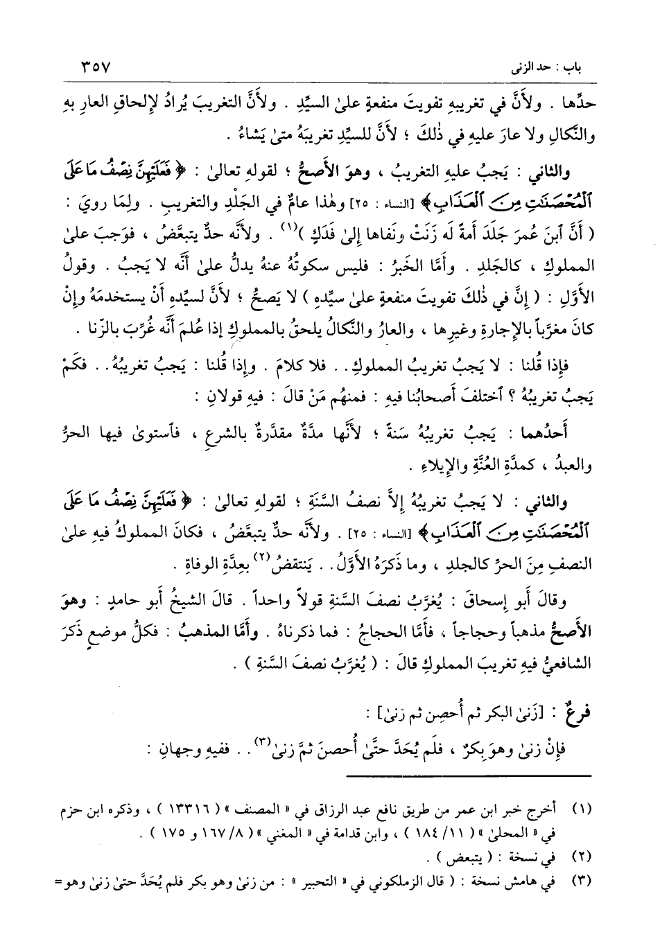 والثاني: يجب عليه التغريب، وهو الأصح؛ لِقَوْلِهِ تَعَالَى: {فَعَلَيْهِنَّ نِصْفُ مَا عَلَى الْمُحْصَنَاتِ مِنَ الْعَذَابِ} [النساء: 25] [النساء: 25] وهذا عام في الجلد والتغريب. ولما رُوِيَ: (أن ابن عمر جلد أمة له زنت ونفاها إلى فدك) . ولأنه حد يتبعض، فوجب على المملوك، كالجلد. وأمَّا الخبر: فليس سكوته عنه يدل على أنه لا يجب. وقول الأول: (إن في ذلك تفويت منفعة على سيده) لا يصح؛ لأن لسيده أن يستخدمه وإن كان مغربا بالإجارة وغيرها، والعار والنَكَال يلحق بالمملوك إذا علم أنه غرب بالزِّنَا.