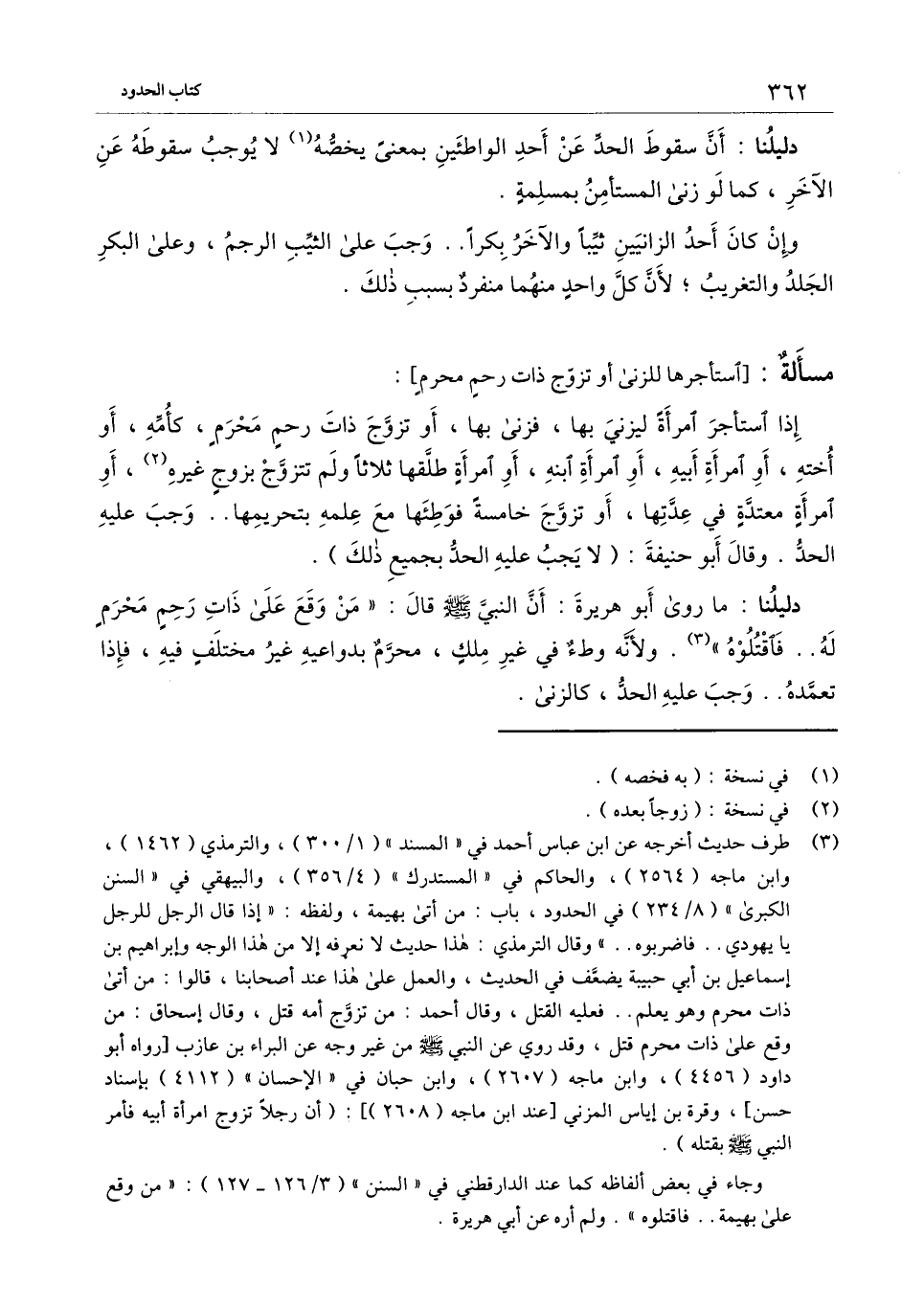 إذا استأجر امرأة ليزني بها، فزنى بها، أو تزوج ذات رحم محرم، كأمه، أو أخته، أو امرأة أبيه، أو امرأة ابنه، أو امرأة طلقها ثلاثا ولم تتزوج بزوج غيره، أو امرأة معتدة في عدتها، أو تزوج خامسة فوطئها مع علمه بتحريمها.. وجب عليه الحد. وقال أبُو حَنِيفَة: (لا يجب عليه الحد بجميع ذلك) .