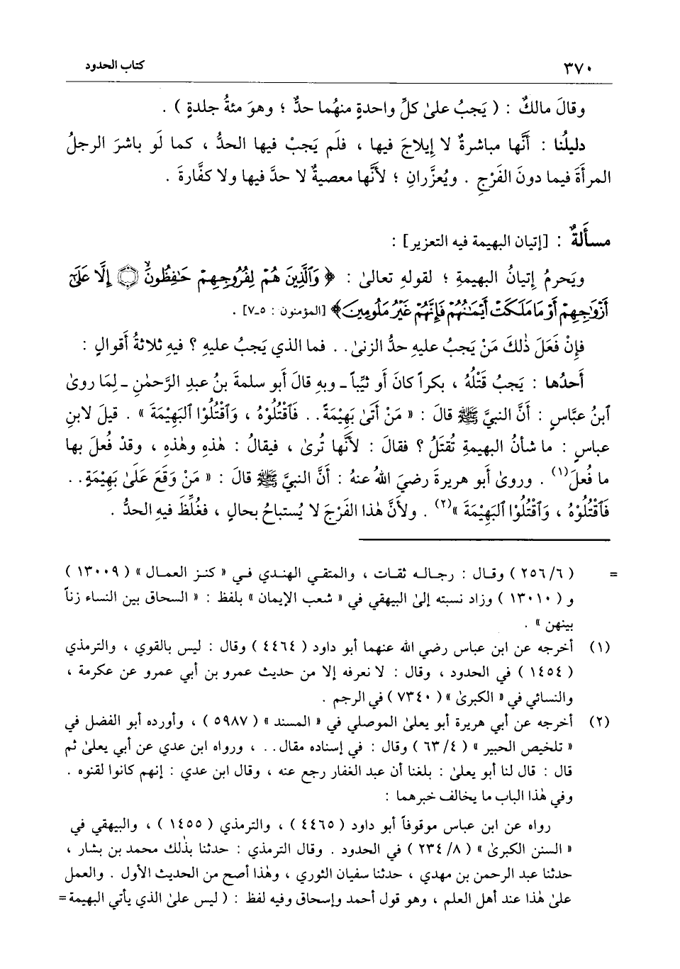 ويحرم إتيان البهيمة؛ لِقَوْلِهِ تَعَالَى: {وَالَّذِينَ هُمْ لِفُرُوجِهِمْ حَافِظُونَ} [المؤمنون: 5] {إِلا عَلَى أَزْوَاجِهِمْ أوْ مَا مَلَكَتْ أَيْمَانُهُمْ فَإِنَّهُمْ غَيْرُ مَلُومِينَ} [المؤمنون: 6] [المؤمنون: 5-7] .