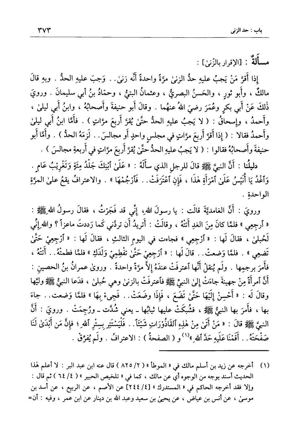 ورُوِي: «أن الغامدية قالت: يا رسول الله، إنِّي قد فجرت، فقال رسول الله، - صَلَّى اللَّهُ عَلَيْهِ وَسَلَّمَ -: " ارجعي " فلما كان من الغد أتته، وقالت: أتريد أن تردني كما رددت ماعزا؟ والله إنِّي لحبلى، فقال لها: " ارجعي " فجاءت في اليوم الثالث، فقال لها: " ارجعي حتى تضعي ". فلما وضعت.. قال لها: " ارجعي حتى تفطمي ولدك " فلما فطمته.. أتته، فأمر برجمها.» ولم ينقل أنها اعترفت عنده إلا مرة واحدة. وروى عمران بن الحصين: «أن امرأة من جهينة جاءت إلى النَّبيّ - صَلَّى اللَّهُ عَلَيْهِ وَسَلَّمَ - فاعترفت بالزِّنَى وهي حبلي، فدعا النَّبيّ - صَلَّى اللَّهُ عَلَيْهِ وَسَلَّمَ - وليها وقال له: " أحسن إليها حتى تضع، فإذا وضعت.. فجئ بها " فلما وضعت.. جاء بها، فأمر بها النَّبيّ - صَلَّى اللَّهُ عَلَيْهِ وَسَلَّمَ - فشبكت عليها ثيابها - يعني شدت- ورجمت» . ورُوِي: «أن النَّبيَّ - صَلَّى اللَّهُ عَلَيْهِ وَسَلَّمَ - قال: من أتى من هذه القاذورات شيئا.. فليستتر بستر الله؛ فإن من أبدى لنا صفحته.. أقمنا عليه حد الله» و (الصفحة) : الاعتراف. ولم يفرق.