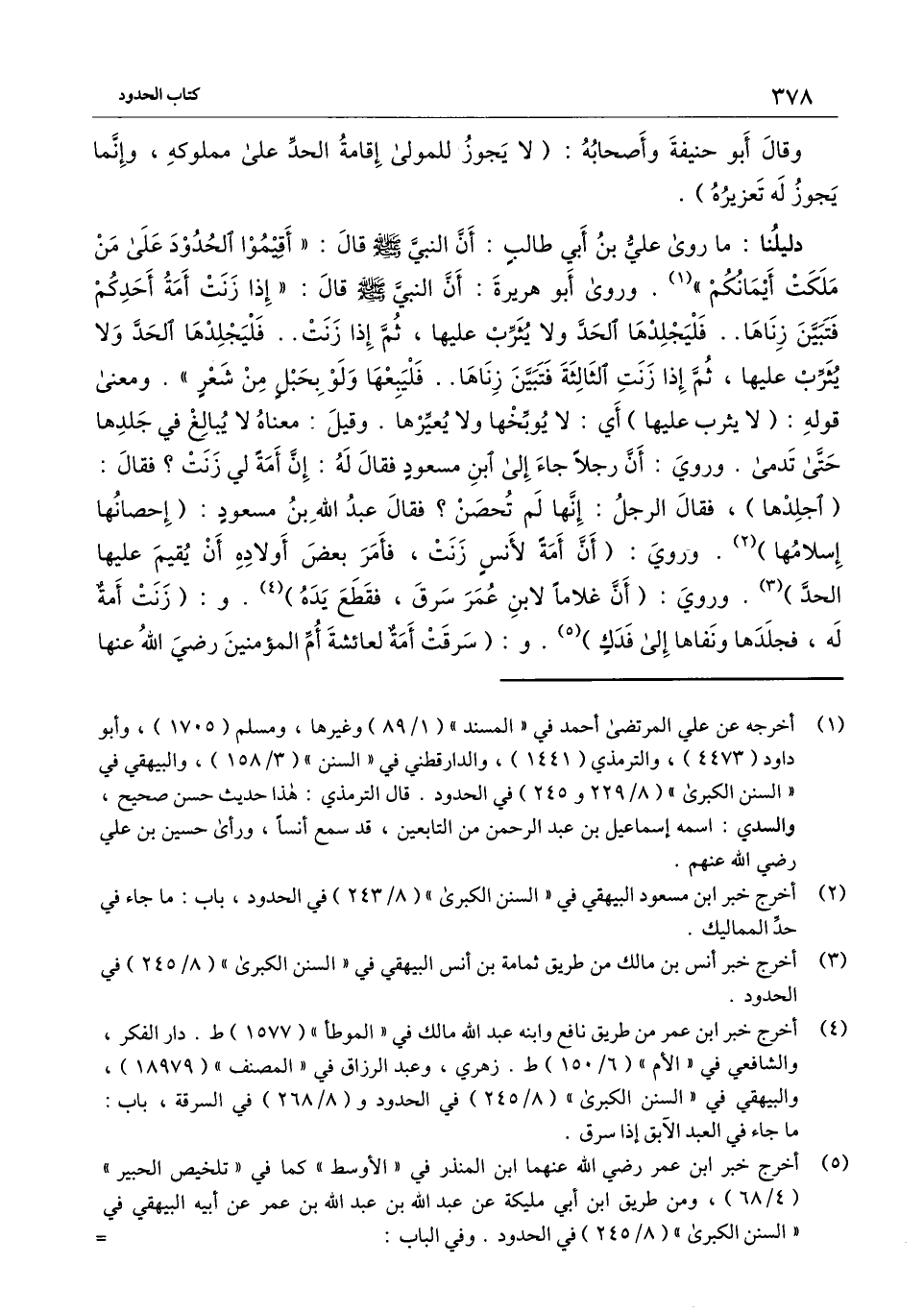 دليلنا: ما روى علي بن أبي طالب: أن النَّبيَّ - صَلَّى اللَّهُ عَلَيْهِ وَسَلَّمَ - قال: «أقيموا الحدود على من ملكت أيمانكم» . ورَوَى أبُو هُرَيرَة: أن النَّبيَّ - صَلَّى اللَّهُ عَلَيْهِ وَسَلَّمَ - قال: «إذا زنت أمة أحدكم فتبين زناها.. فليجلدها الحد ولا يثرب عليها، ثم إذا زنت.. فليجلدها الحد ولا يثرب عليها، ثم إذا زنت الثالثة فتبين زناها.. فليبعها ولو بحبل من شعر» . ومعنى قوله: (لا يثرب عليها) أي: لا يوبخها ولا يعيرها. وقيل: معناه لا يبالغ في جلدها حتى تدمى. ورُوِي: أن رجلا جاء إلى ابن مَسعُودٍ، فقال له: إن أمة لي زنت؟ فقال: (اجلدها) ، فقال: الرجل: إنها لم تحصن؟ فقال عبد الله بن مَسعُودٍ: (إحصانها إسلامها) . ورُوِي: (أن أمة لأنس زنت، فأمر بعض أولاده أن يقيم عليها الحد) . ورُوِي: (أن غلاما لابن عمر سرق، فقطع يده) . و: (زنت أمة له، فجلدها ونفاها إلى فدك) . و: (سرقت أمة لعائشة أم المؤمنين - رَضِيَ اللَّهُ عَنْهَا -